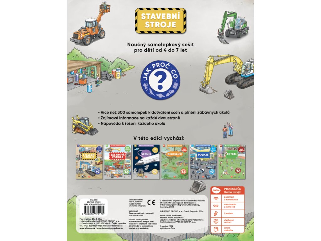 Jak? Proč? Co? V tomhle naučném samolepkovém sešitě pro děti od 4 do 7 let najdete odpovědi snad na všechny zvídavé otázky týkající se stavění a stavebních strojů. Na každé dvoustraně se dočtete spoustu zajímavostí, a navíc máte k dispozici přes 300 samolepek k dotváření scén a plnění zábavných úkolů! Ty zapeklitější vám dají možná trošku zabrat, ale žádný strach – na konci knížky nechybí malá nápověda…