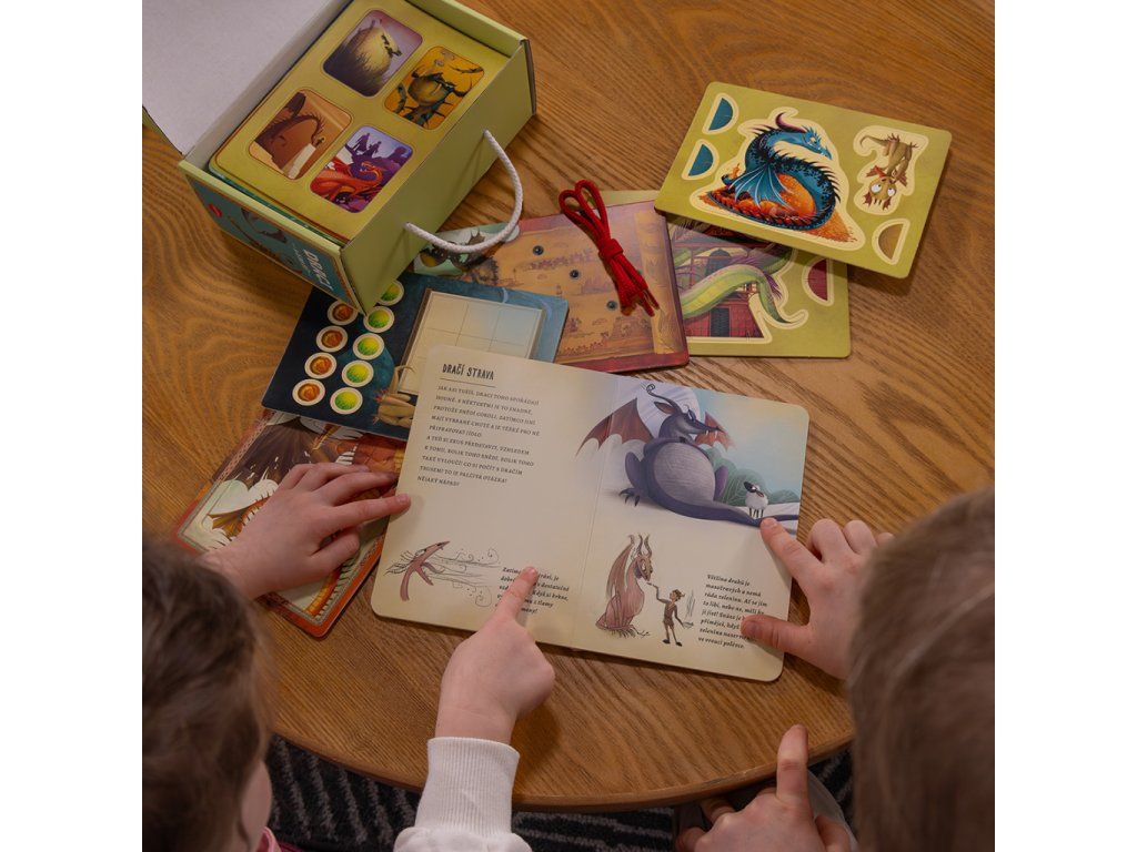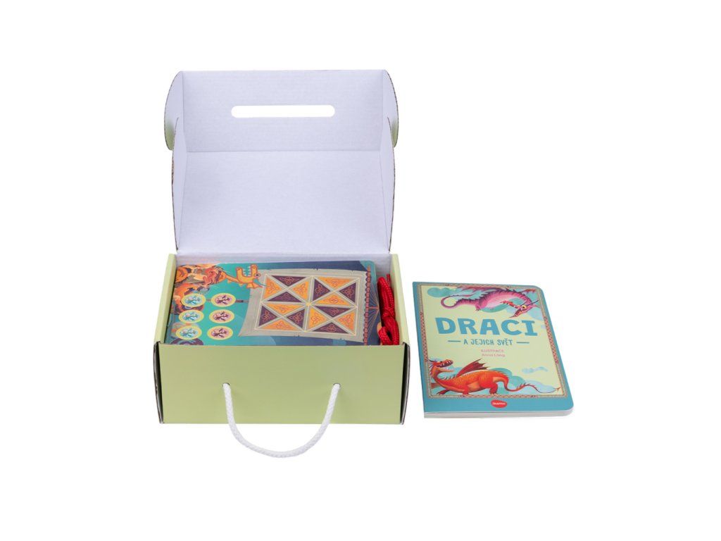 Box plný zábavy, který snadno vezmete kamkoli s sebou, obsahuje knížku a 20 karet pro různé aktivity a hry, které zaručeně ocení každý fanoušek draků. Nahlédněte do světa těchto fascinujících tvorů! Díky jednoduchým, ale nadmíru zajímavým informacím obsaženým v přiložené knize se o nich dozvíte vše podstatné – zejména pokud byste měli rádi jednoho jako domácího mazlíčka! Poznávejte a bavte se: skládejte puzzle, navlékejte, zahrajte si pexeso, piškvorky, utkejte se v dračích soubojích, vymýšlejte fantastické příběhy nebo si vyrobte figurky draků.