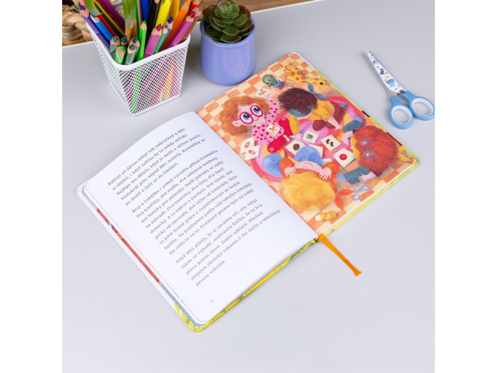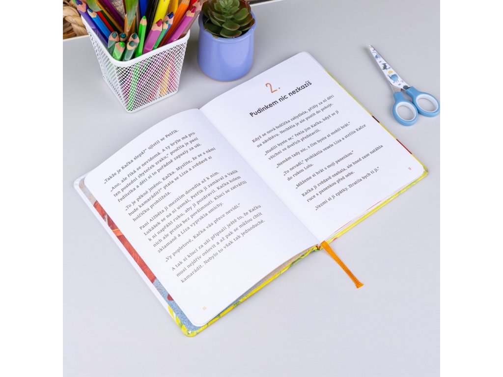 Partu dětí z domova U Sluníčka už možná znáte z knížky Hurá do Kaktusova! Ve volně navazujícím titulu přibude do téhle veselé party nová holčička Kačka, která je nevidomá. Kamarádi pro ni proto vymýšlejí speciální hry a aktivity, aby ji začlenili mezi sebe. Když se pak ve psí škole seznámí s pejsky, kteří pomáhají slabozrakým, rozhodnou se udělat první poslední, aby Kačka, až přijde ten správný čas, jednoho takového psího pomocníka také mohla mít…
