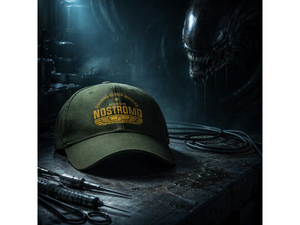 Tmavě zelená baseballová kšiltovka s logem vesmírné lodi USCSS Nostromo z ikonického filmu Vetřelec.