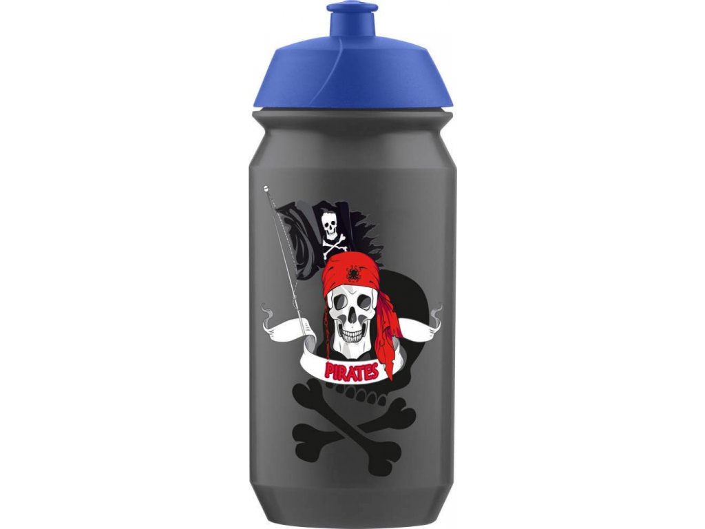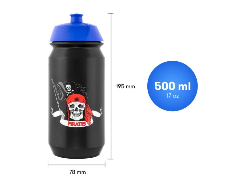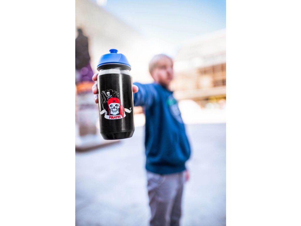 Černá láhev s pirátským potiskem a modrým pítkem. Objem láhve je 500 ml.