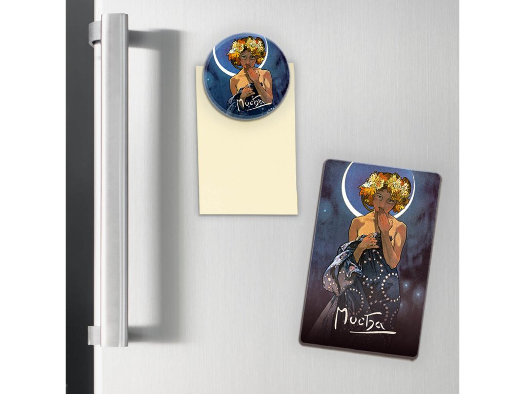 Kulatý magnet s motivem světově známého Alfonse Muchy, který můžete využít k přichycení vzkazů, fotek apod....