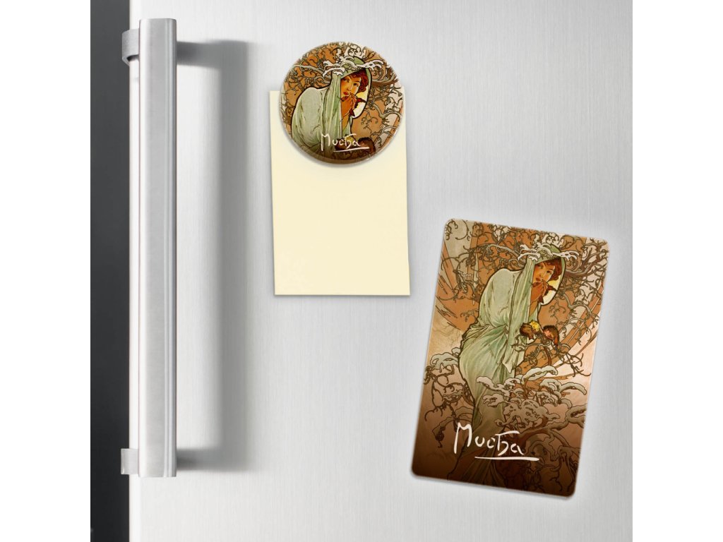 Kulatý magnet s motivem světově známého Alfonse Muchy, který můžete využít k přichycení vzkazů, fotek apod.