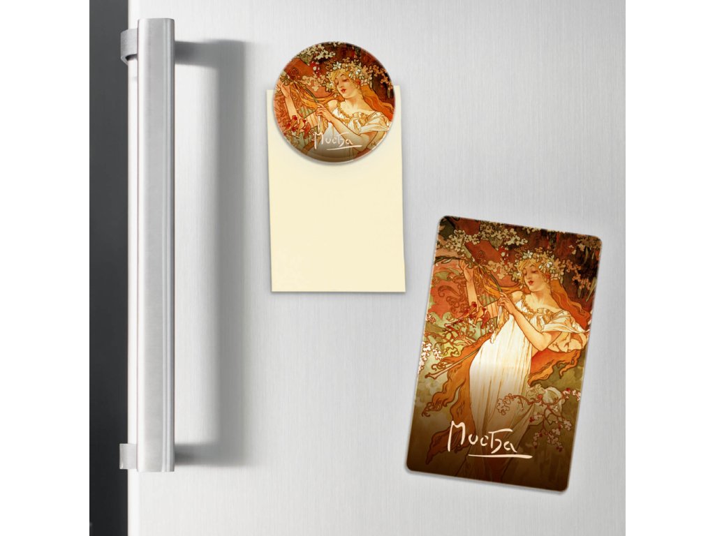 Kulatý magnet s motivem světově známého Alfonse Muchy, který můžete využít k přichycení vzkazů, fotek apod....