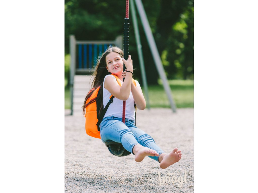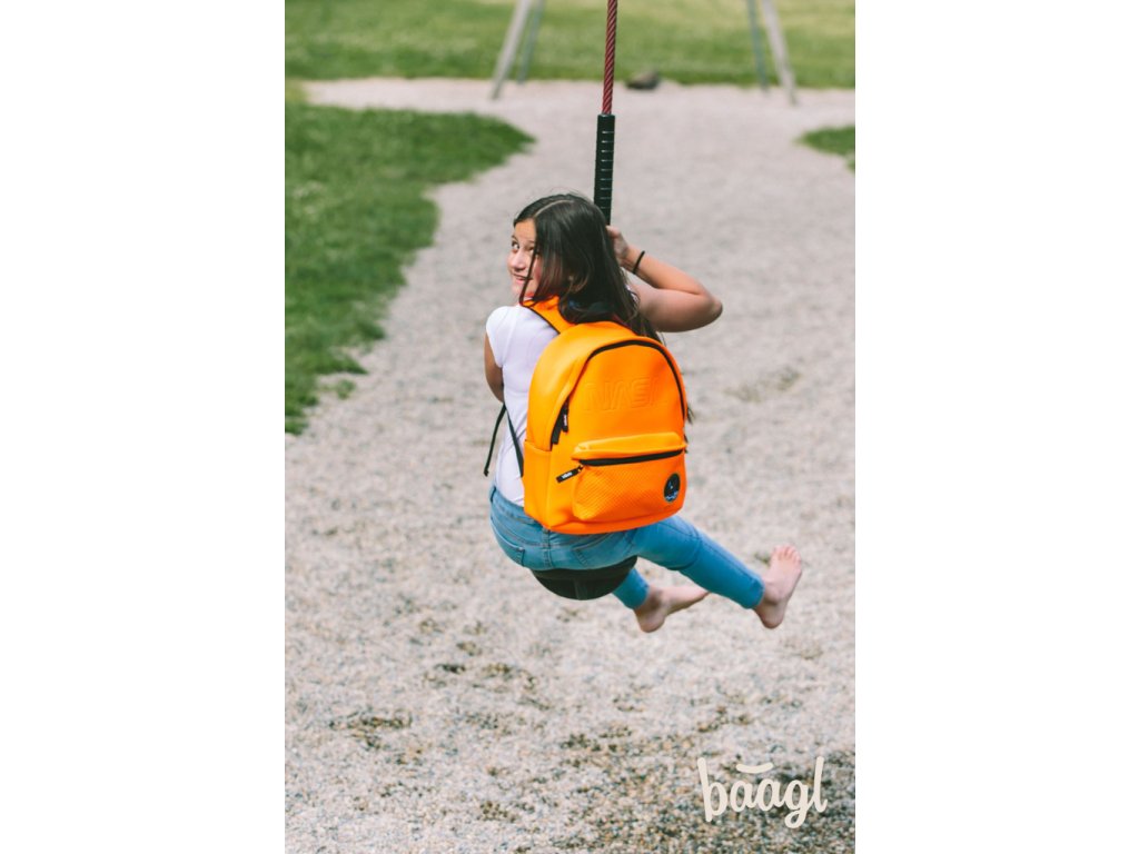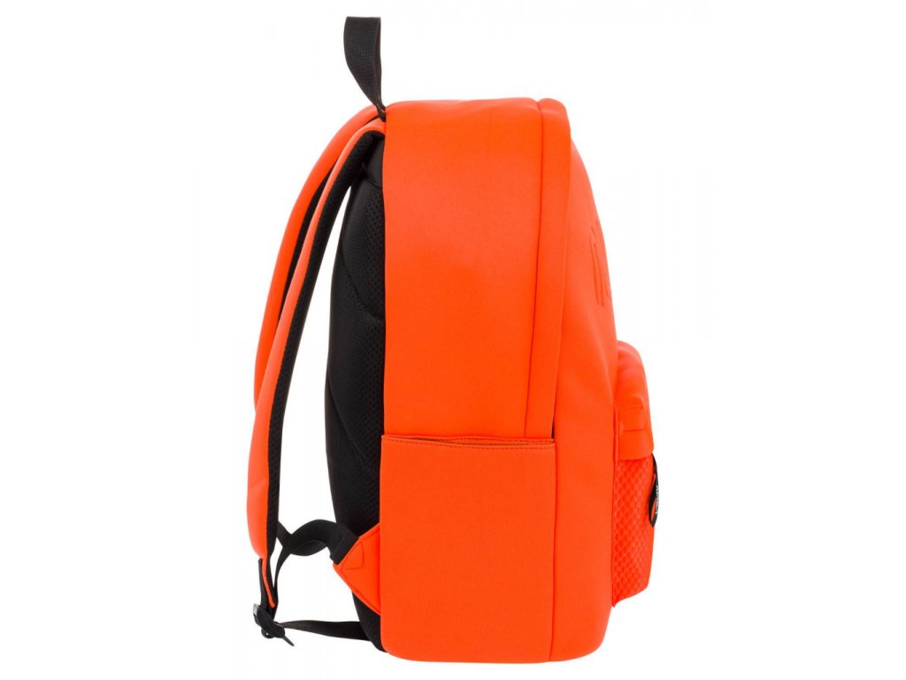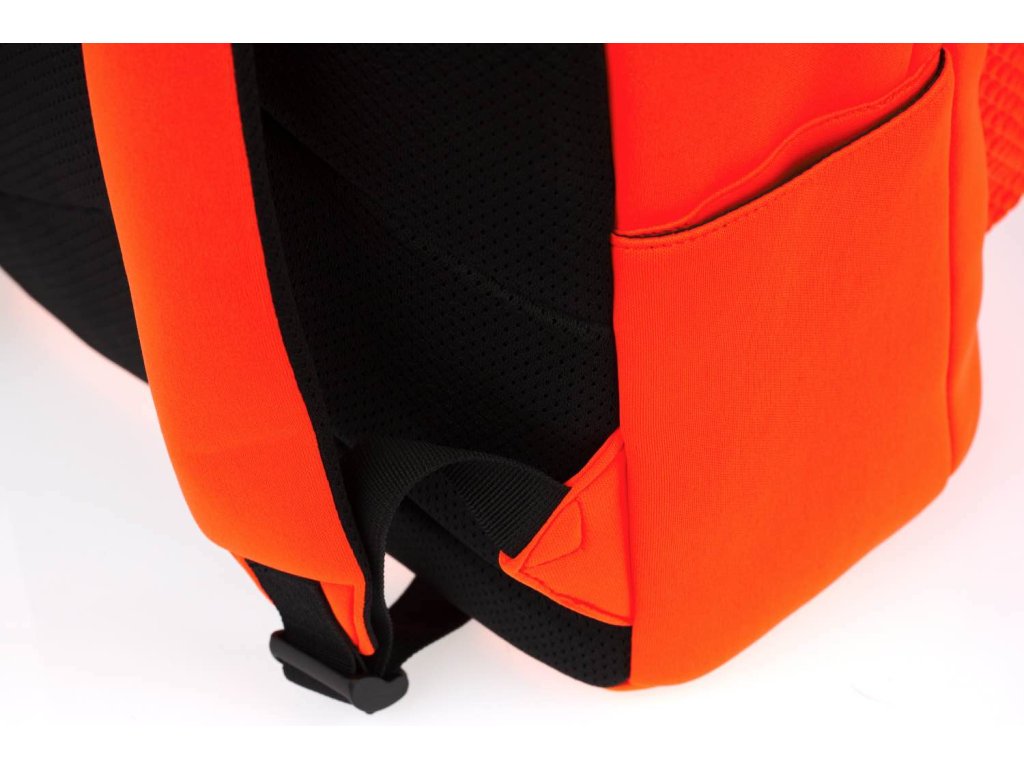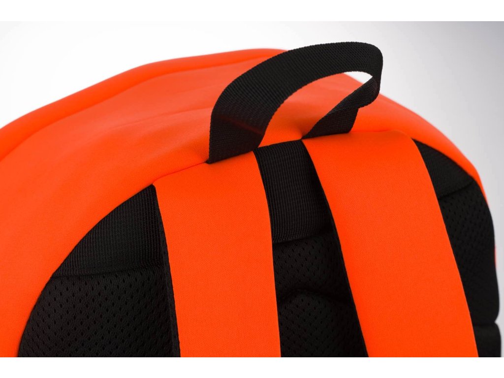 Výrazně oranžový batoh z netradičního neoprenového materiálu.