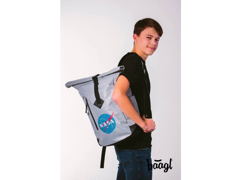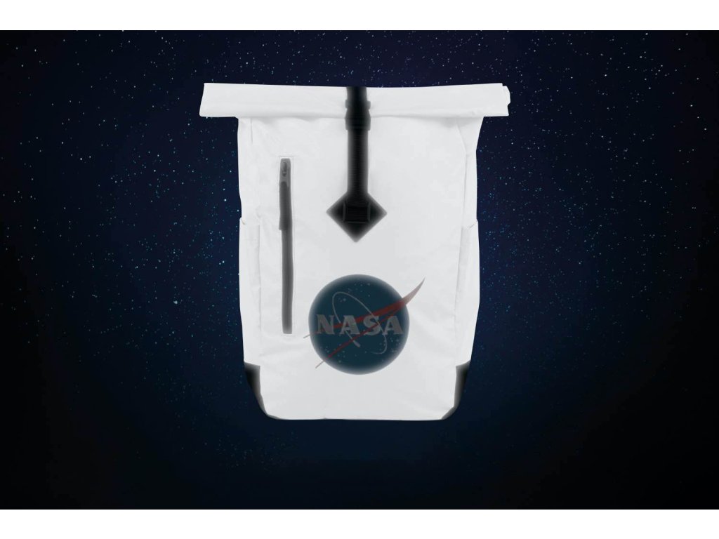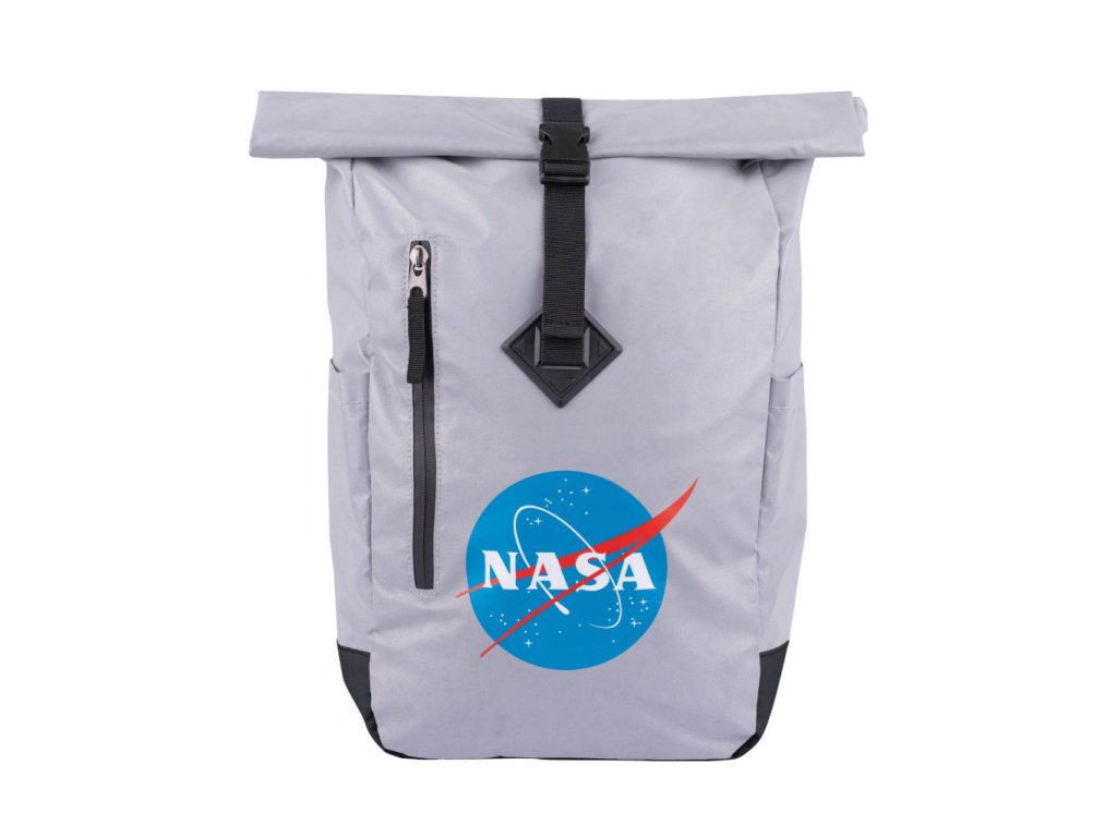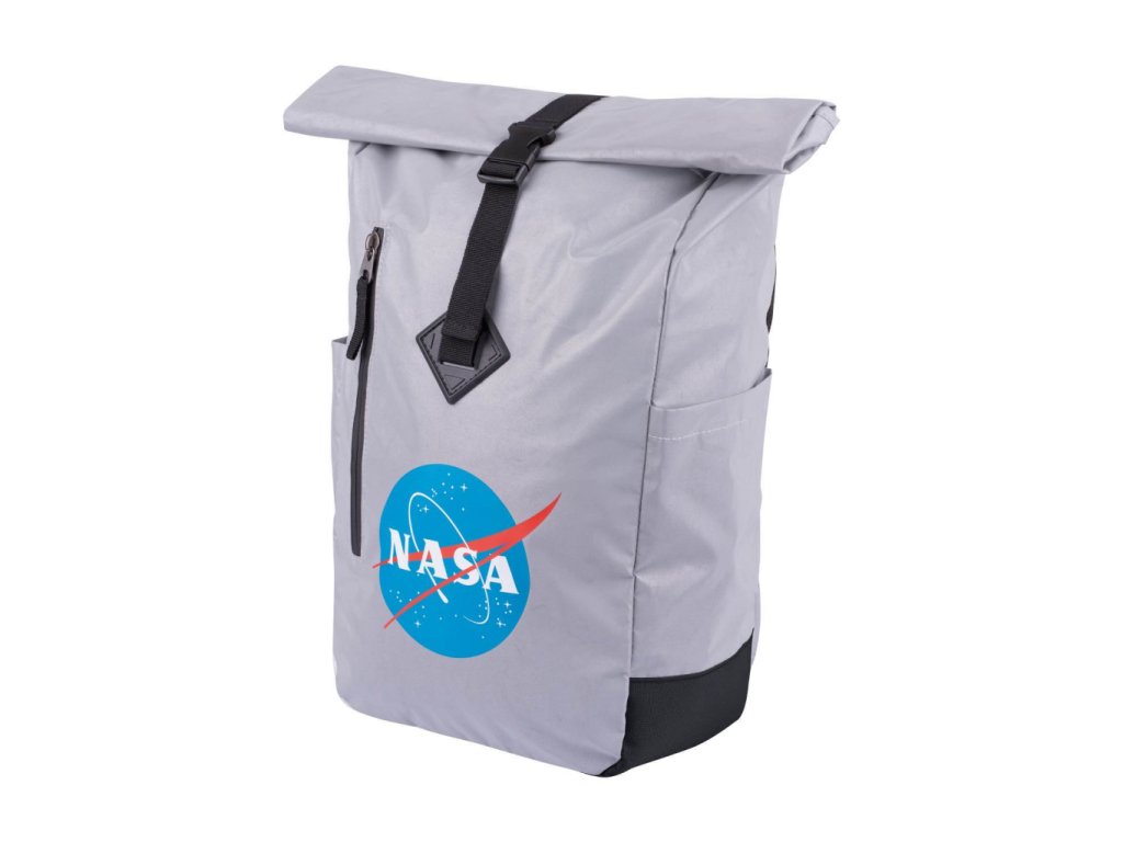 Stříbrný rolovací batoh s ikonickým logem NASA.