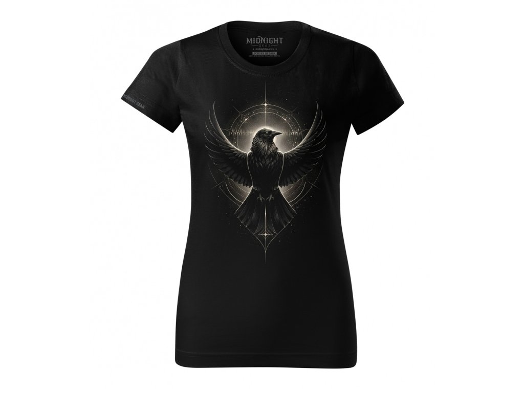 Černé bavlněné tričko prémiové kvality značky Midnight Gear v kolekci ECHOES IN DARK s motivem havrana jako posla ticha a nositele skrytých zpráv.