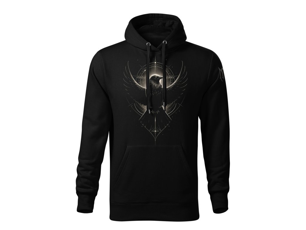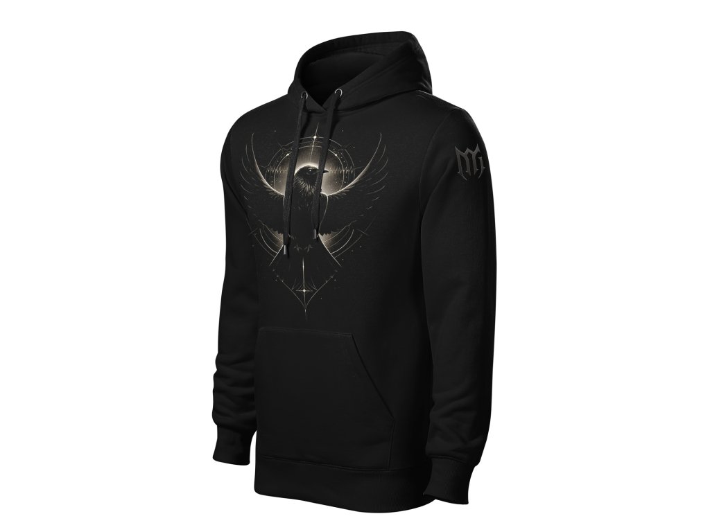 Černá mikina s kapucí značky Midnight Gear v kolekci ECHOES IN DARK s motivem havrana jako posla ticha a nositele skrytých zpráv.