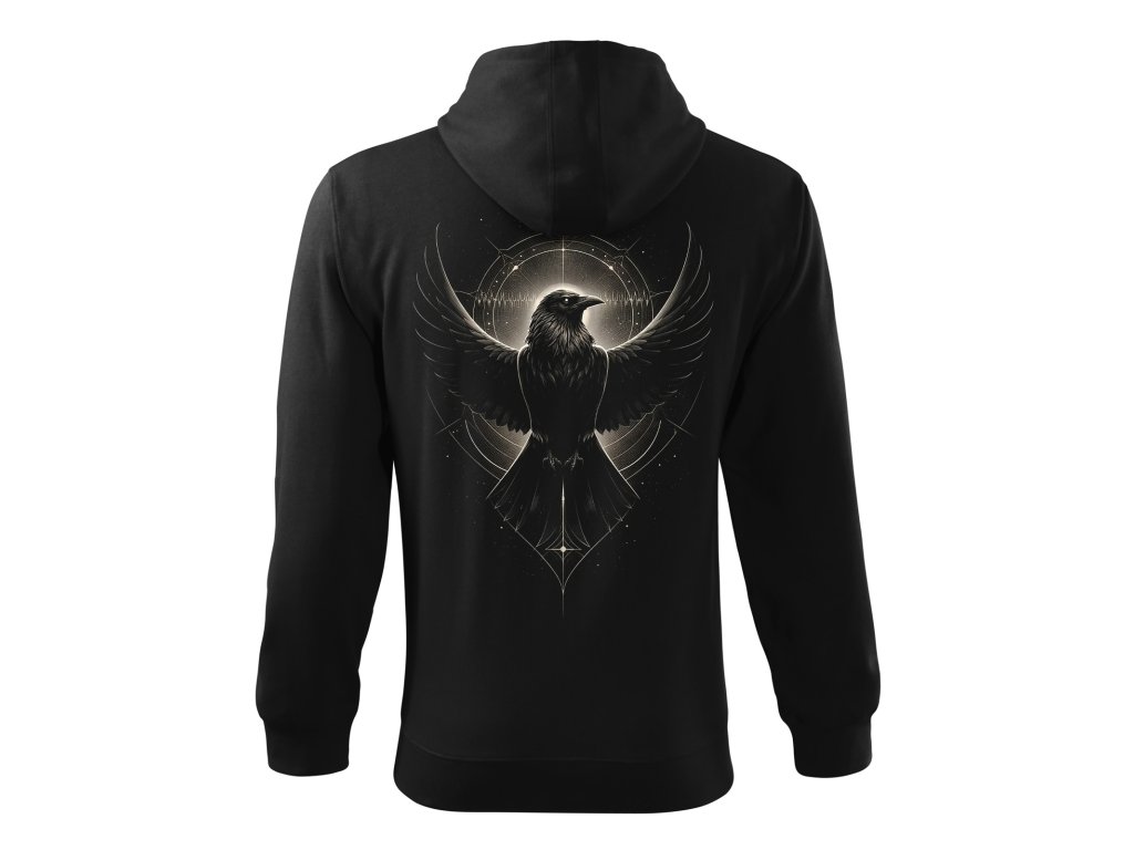 Černá mikina na zip s kapucí značky Midnight Gear v kolekci ECHOES IN DARK s motivem havrana jako posla ticha a nositele skrytých zpráv.