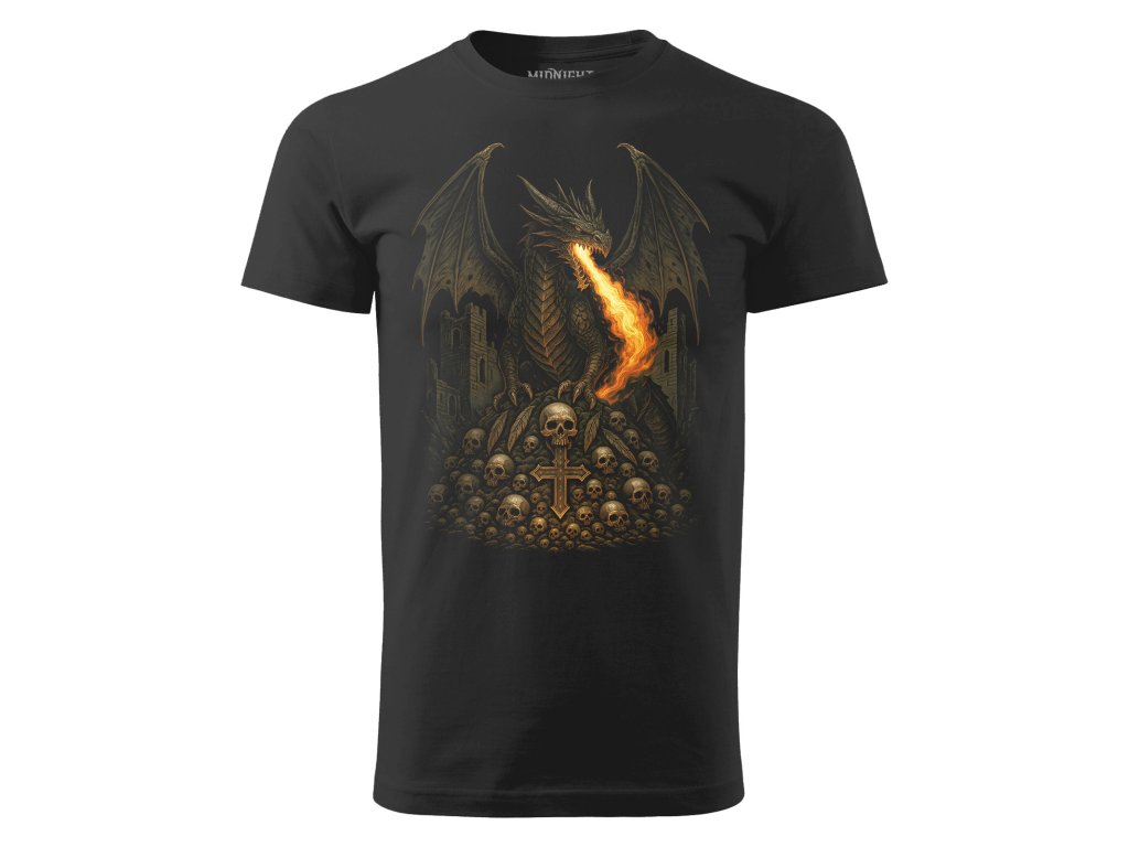 Černé bavlněné tričko prémiové kvality s motivem draka dštícího oheň.