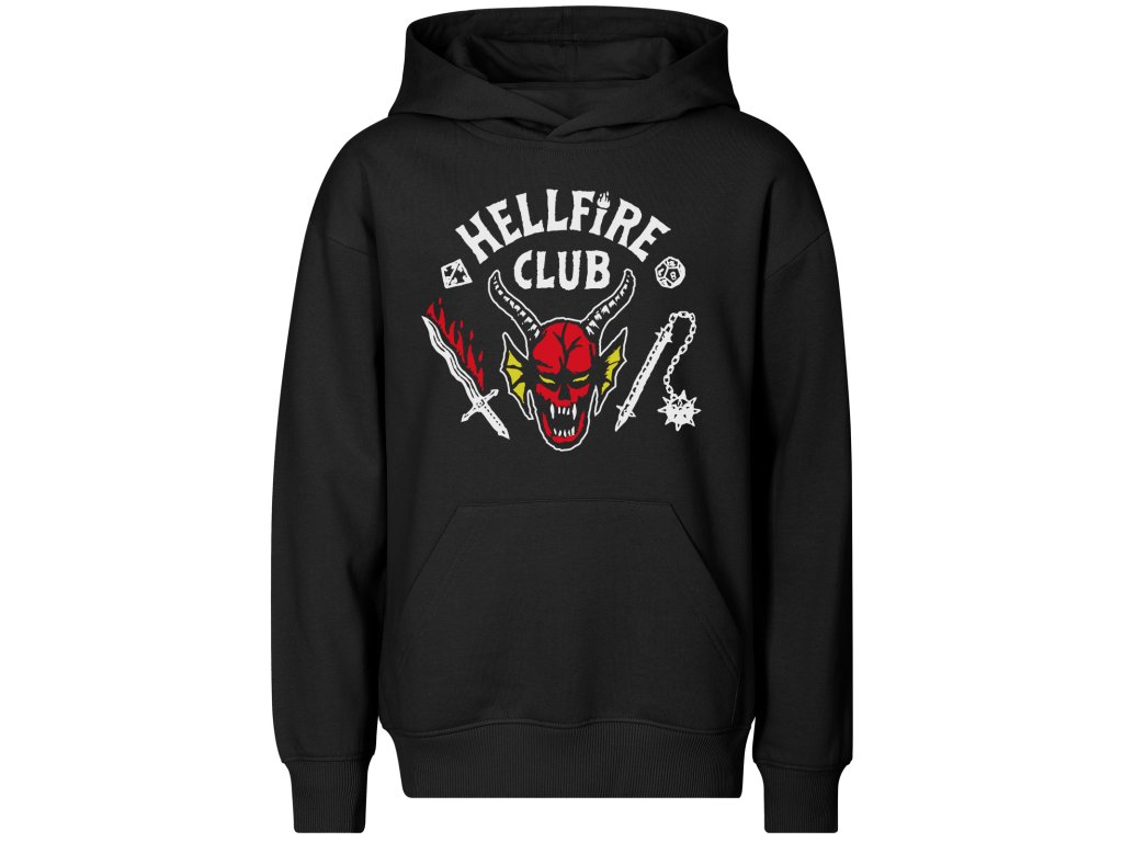 Černá mikina / klokanka s kapucí a motivem loga Hellfire Clubu ze čtvrté série jednoho z nejlepších seriálů současnosti STRANGER THINGS.