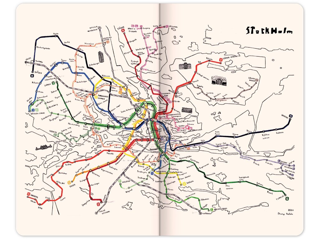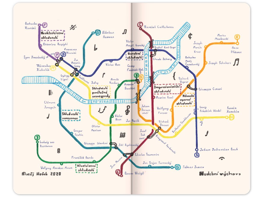 Zápisník s umělecky pojatými plány fiktivní pražské hromadné dopravy od mladého designéra Matěje Hoška.