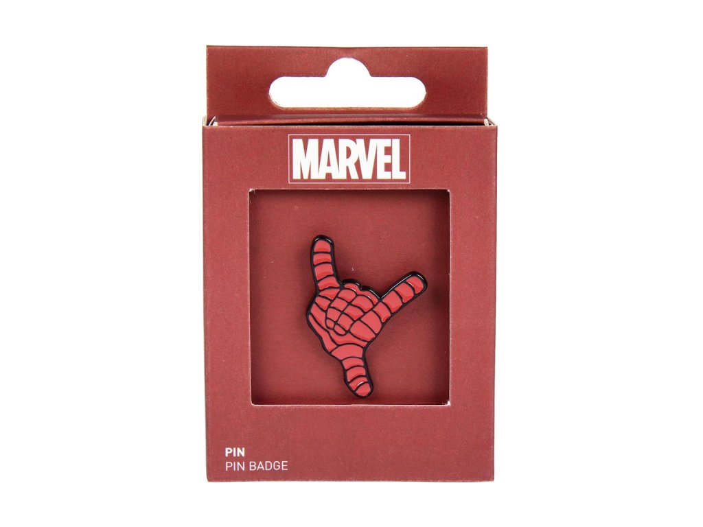Kovový odznáček s motivem typického gesta ruky pavoučího hrdiny Spidermana z nakladatelství Marvel Comics.