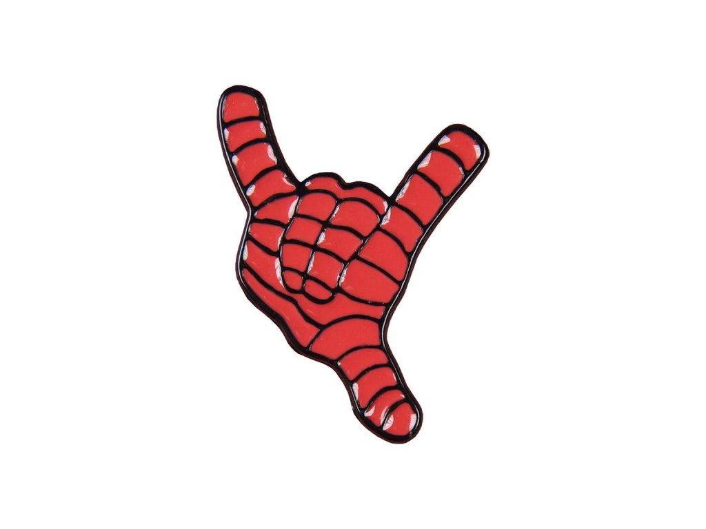 Kovový odznáček s motivem typického gesta ruky pavoučího hrdiny Spidermana z nakladatelství Marvel Comics.