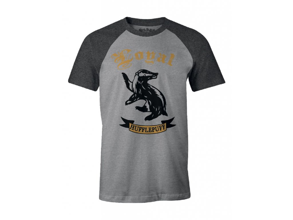 Šedé bavlněné tričko s krátkým rukávem a znakem koleje Mrzimoru s jedním z jeho hlavních hesel: Loajalita / Věrnost