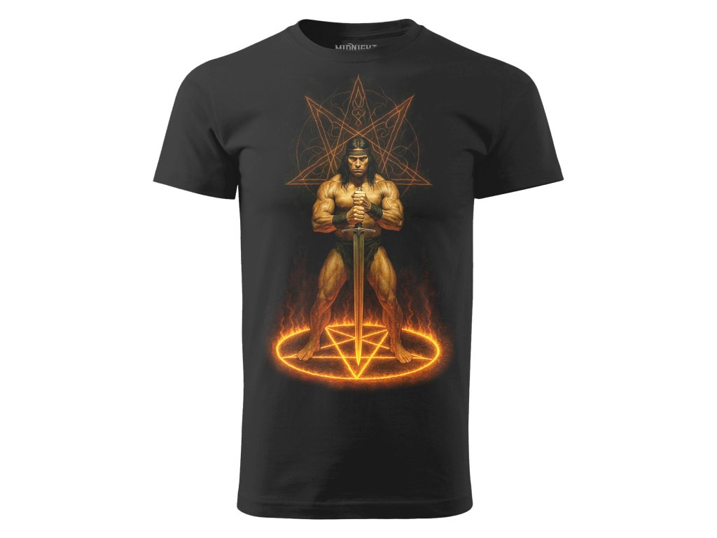 Černé bavlněné tričko prémiové kvality značky Midnight Gear s motivem Barbara Conana stojící v ohnivém pentagramu.