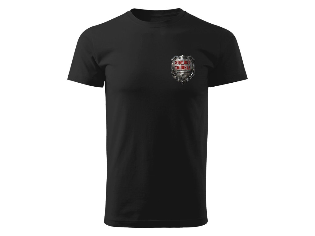 Pánské bavlněné tričko s motivem policejního odznaku s hláškou "Stay out of Trouble" z klasického akčního sci-fi filmu Paula Verhoevena Robocop.
