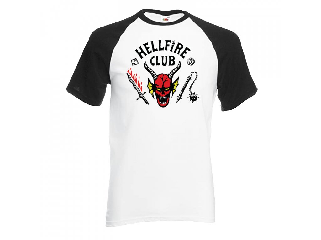Bílé bavlněné tričko s černým krátkým rukávem a motivem loga Hellfire Clubu ze čtvrté série jednoho z nejlepších seriálů současnosti STRANGER THINGS.