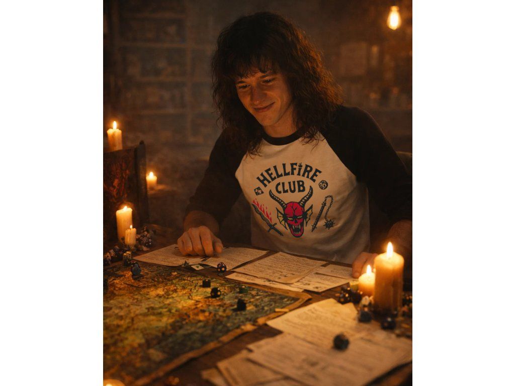 Bílé bavlněné tričko s dlouhým černým rukávem a motivem loga Hellfire Clubu ze čtvrté série jednoho z nejlepších seriálů současnosti STRANGER THINGS.