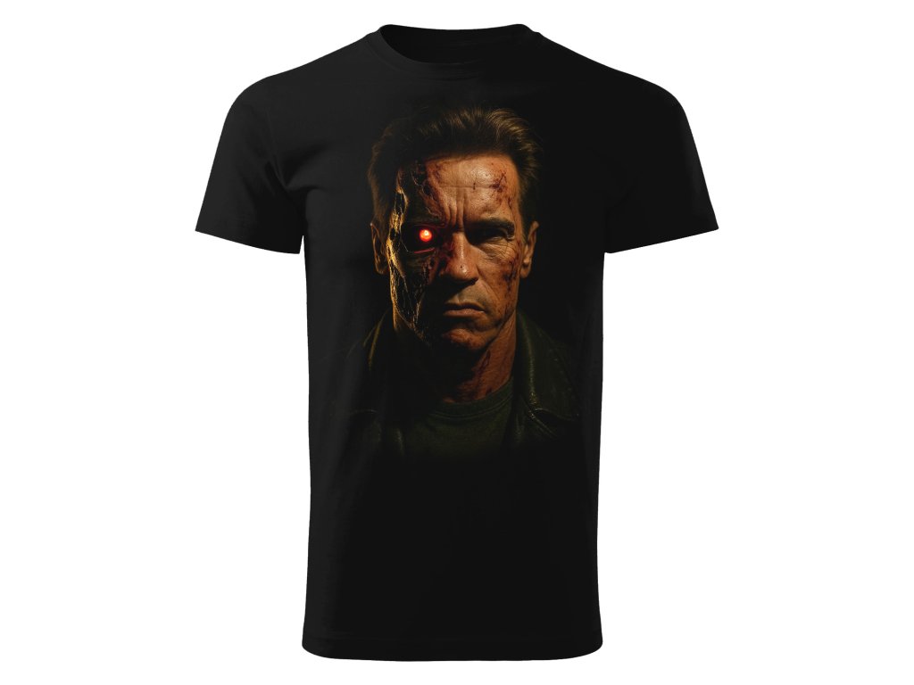 Černé bavlněné tričko s motivem detailního obličeje poničeného Terminátora T-800.