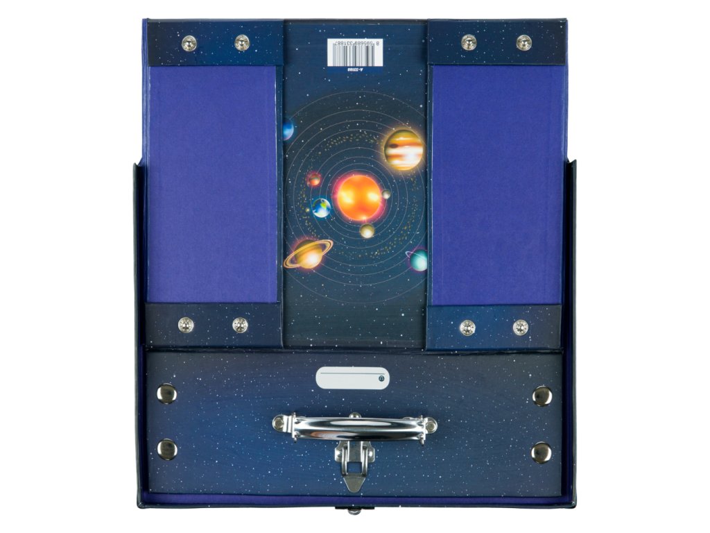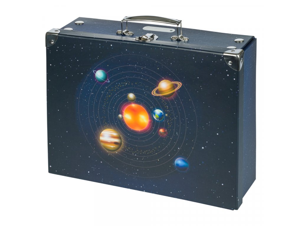 • Skládací kufřík z pevného laminovaného papíru s okovanými rohy.