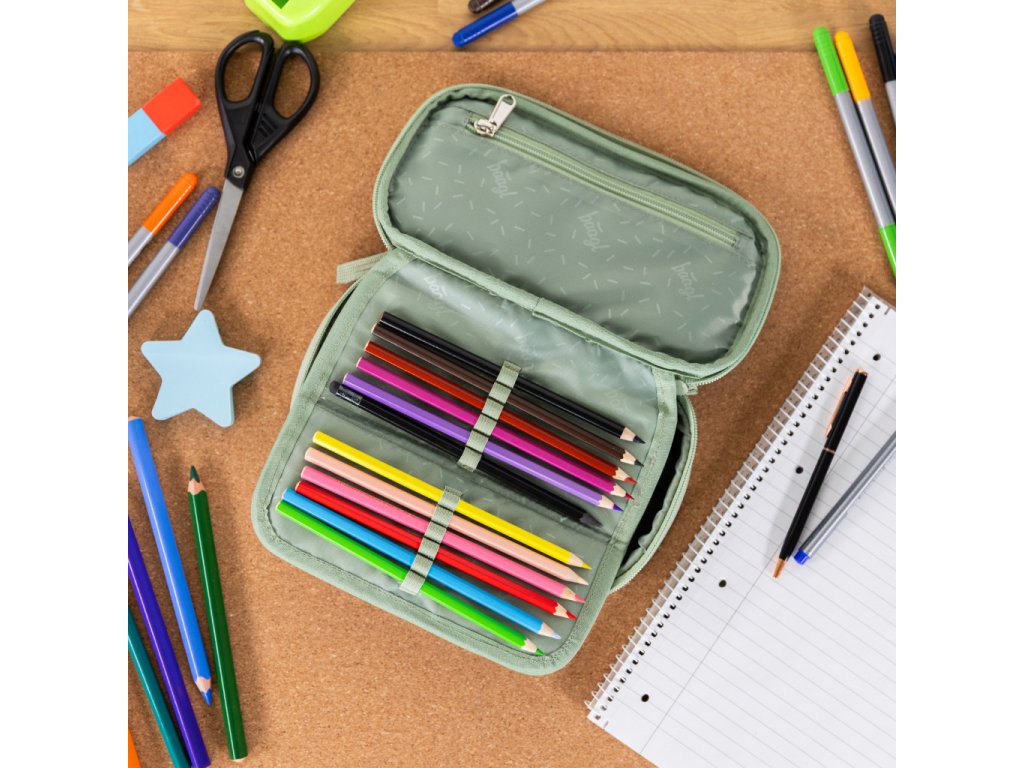 • Kompaktní penál na zip s prostornou hlavní komorou a dvojitou výklopnou chlopní nabízí dostatek prostoru pro psací potřeby i drobnosti.