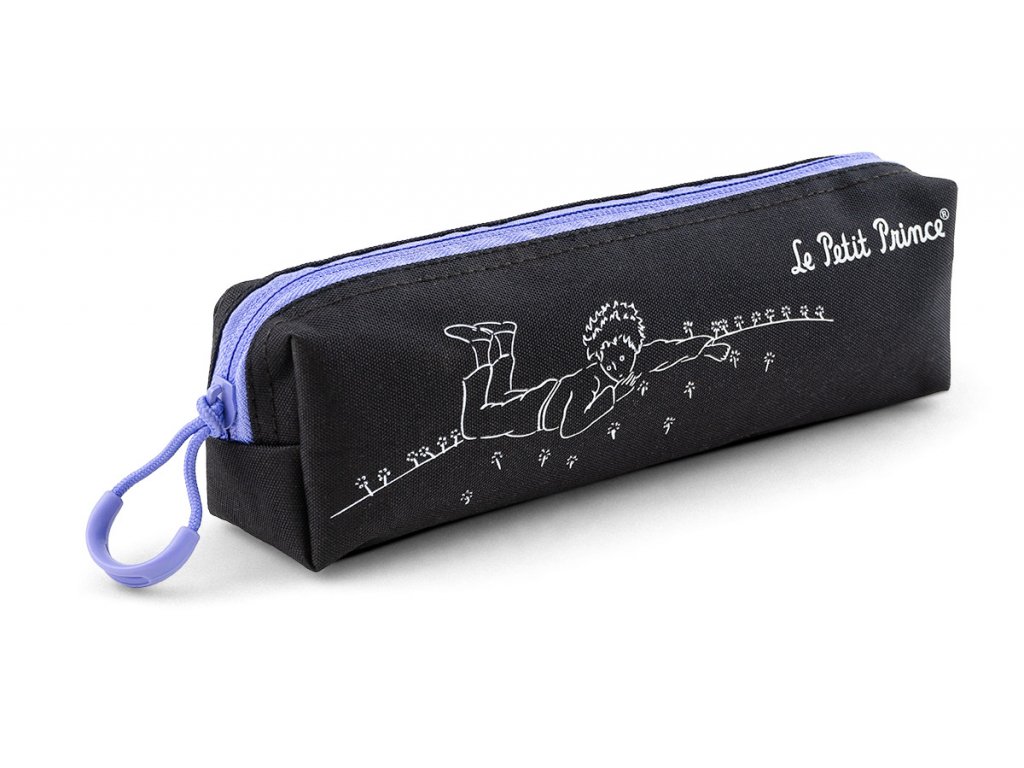 Černá etue na tužky, pera a jiné drobnosti s oblíbeným motivem Malého prince, fialovým zipem a táhlem.