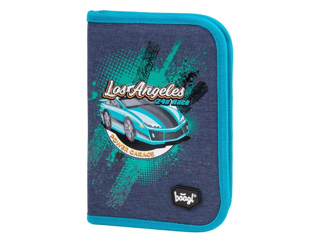 Klasický dvouchlopňový penál s motivem závodního auta v modré barvě.
