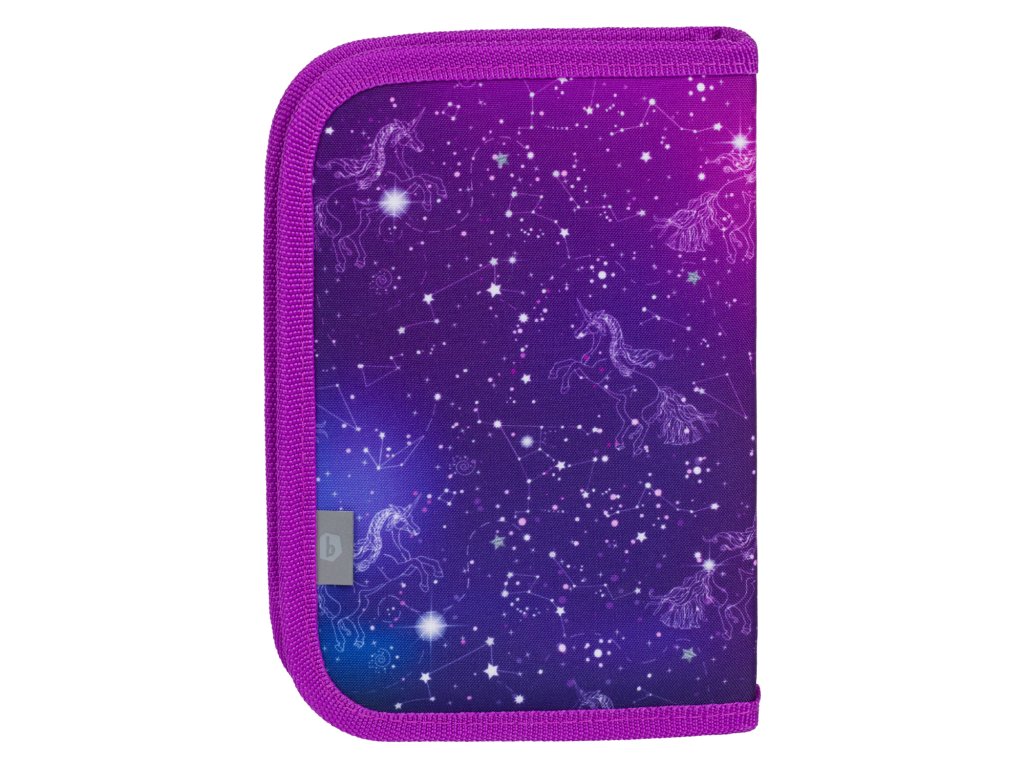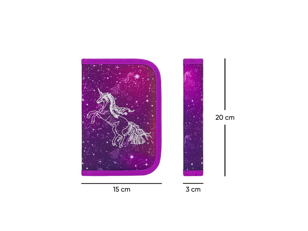 Klasický penál temně fialové barvy se souhvězdím jednorožce, jedním zipem a prostorem pro snadnější orientaci. Doporučujeme dětem od 1. třídy ZŠ. Penál se po otevření rozbalí, takže se do něj vše pohodlně vejde.