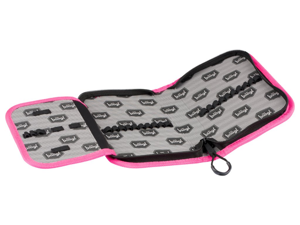 Klasický školní penál v zelené barvě s výrazně růžovými detaily.