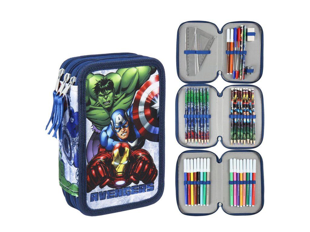 Třípatrový penál s plnou výbavou a motivem hlavních hrdinů týmu Avengers studia Marvel.