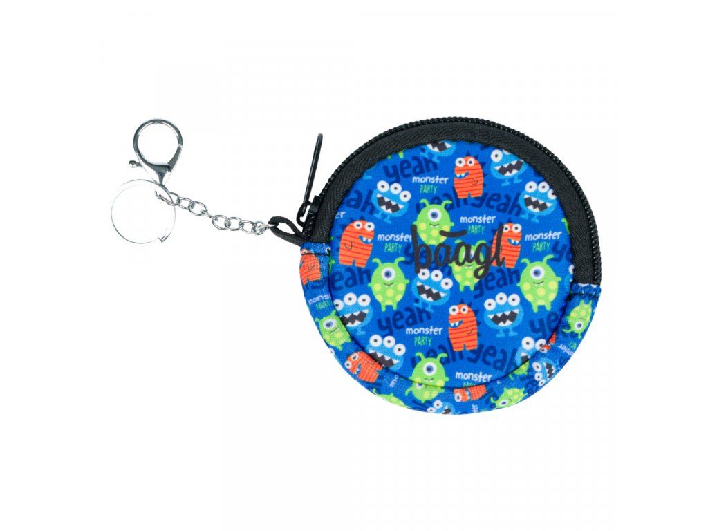 Kulatá neoprenová peněženka s motivem veselých příšerek, laděná do modré barvy.