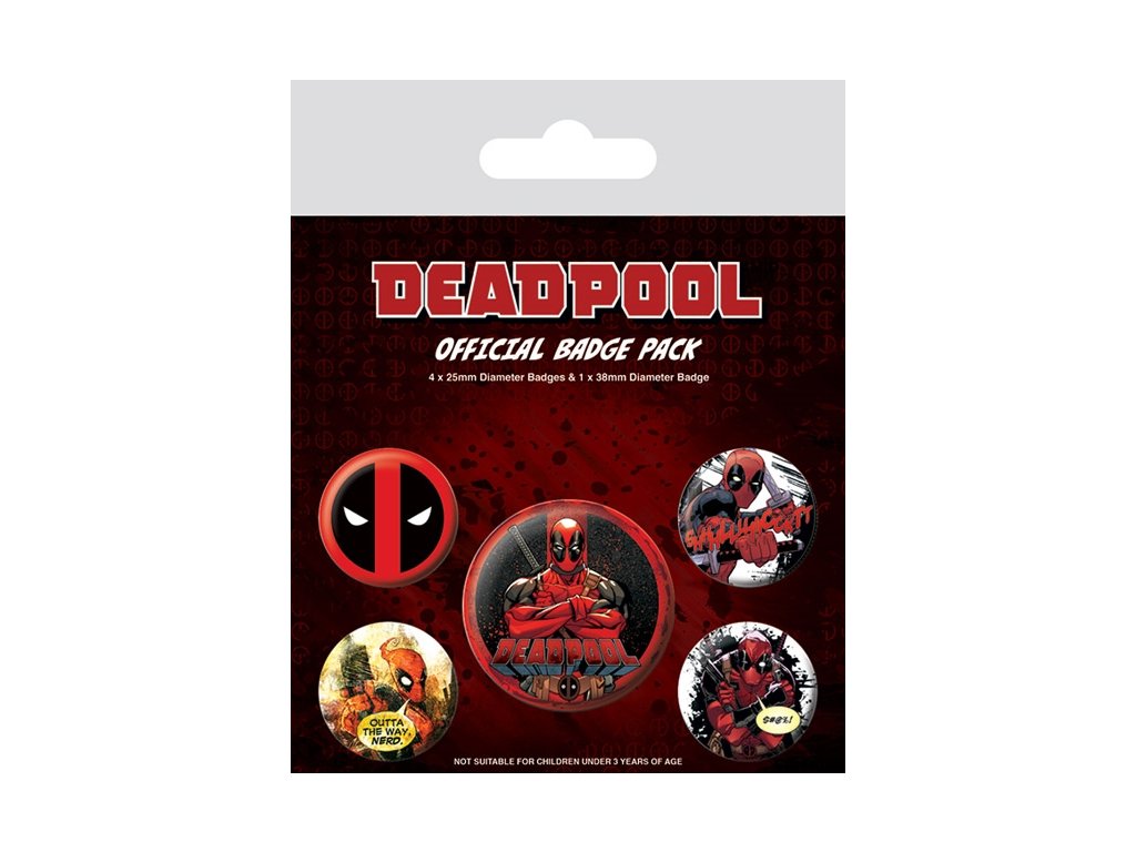 Balení pěti kusů placek o průměru 25 a 38 mm drsně vtipného anihrdiny z dílny Marvel jménem DEADPOOL.