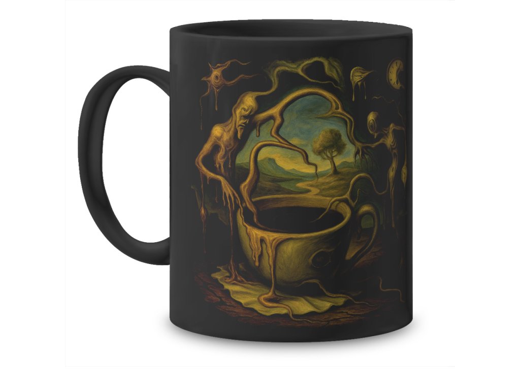 Vtipný černý keramický hrnek pro každého, kdo v horkém nápoji nachází únik z reality.
