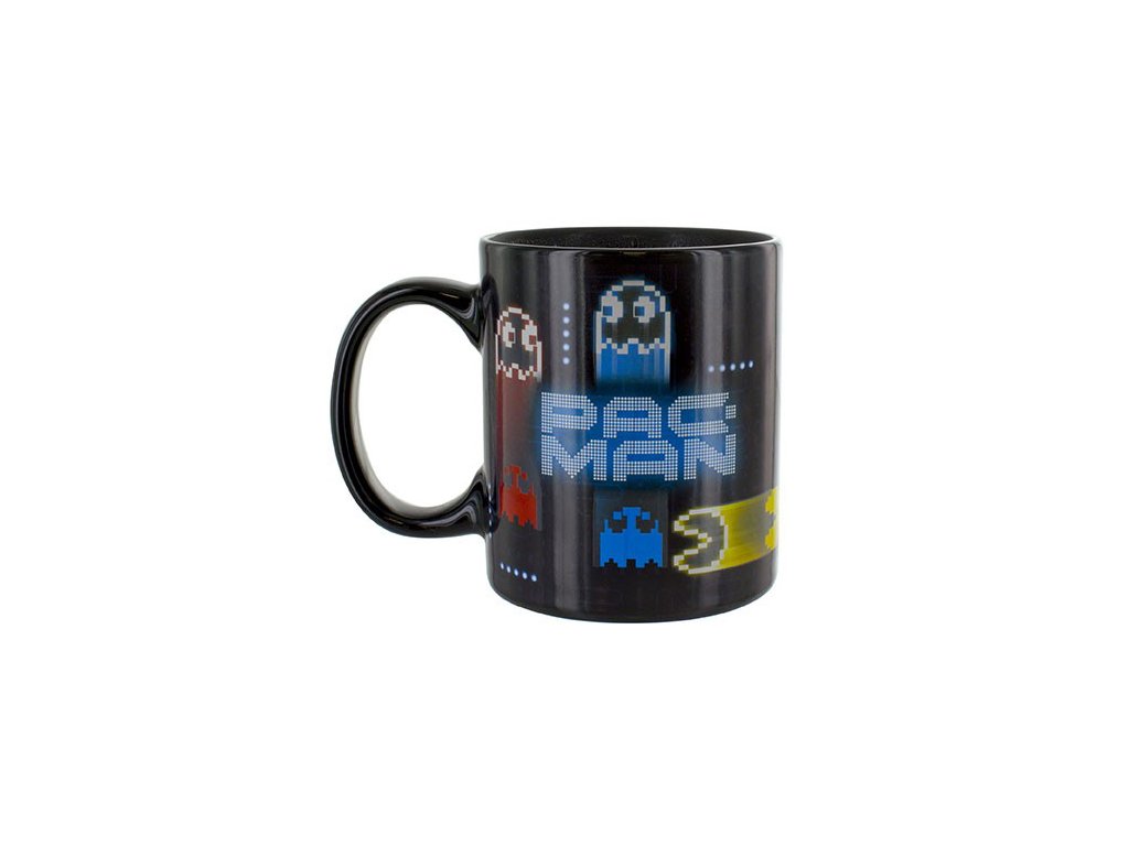Černý keramický hrnek s motivem kultovní 8bitové hry Pac-Man, který se vám po nalití teplého nápoje promění před očima v bláznivou honičku.