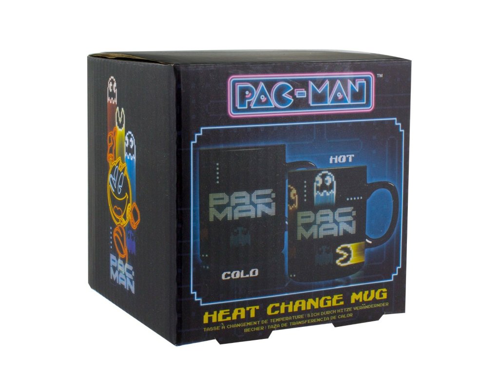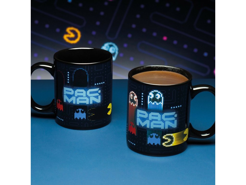 Černý keramický hrnek s motivem kultovní 8bitové hry Pac-Man, který se vám po nalití teplého nápoje promění před očima v bláznivou honičku.