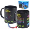 Černý keramický hrnek s motivem kultovní 8bitové hry Space Invaders, na kterém se po nalití teplého nápoje rozpoutá integalaktická bitva.
