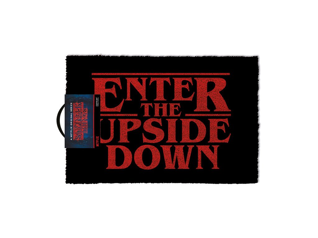 Černá rohožka s červeným textem: "Enter the Upside Down" (v překladu: "Vstupte do světa Upside Down / Nohama vzhůru").
