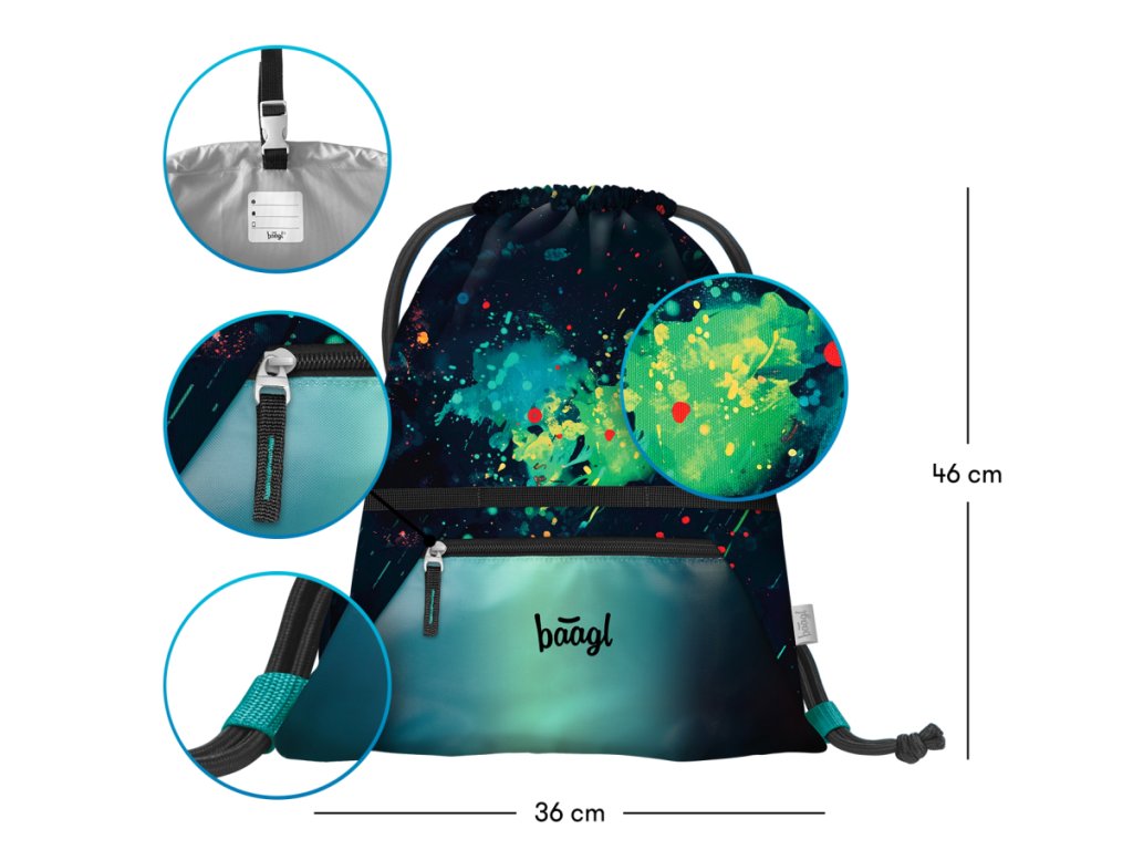 • Praktický sáček s kapsou na zip je vhodný nejen na přezůvky do školy, ale také na cesty, do města, na sportovní či jiné volnočasové aktivity.
