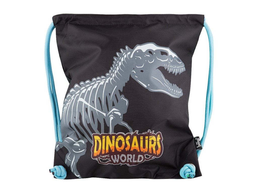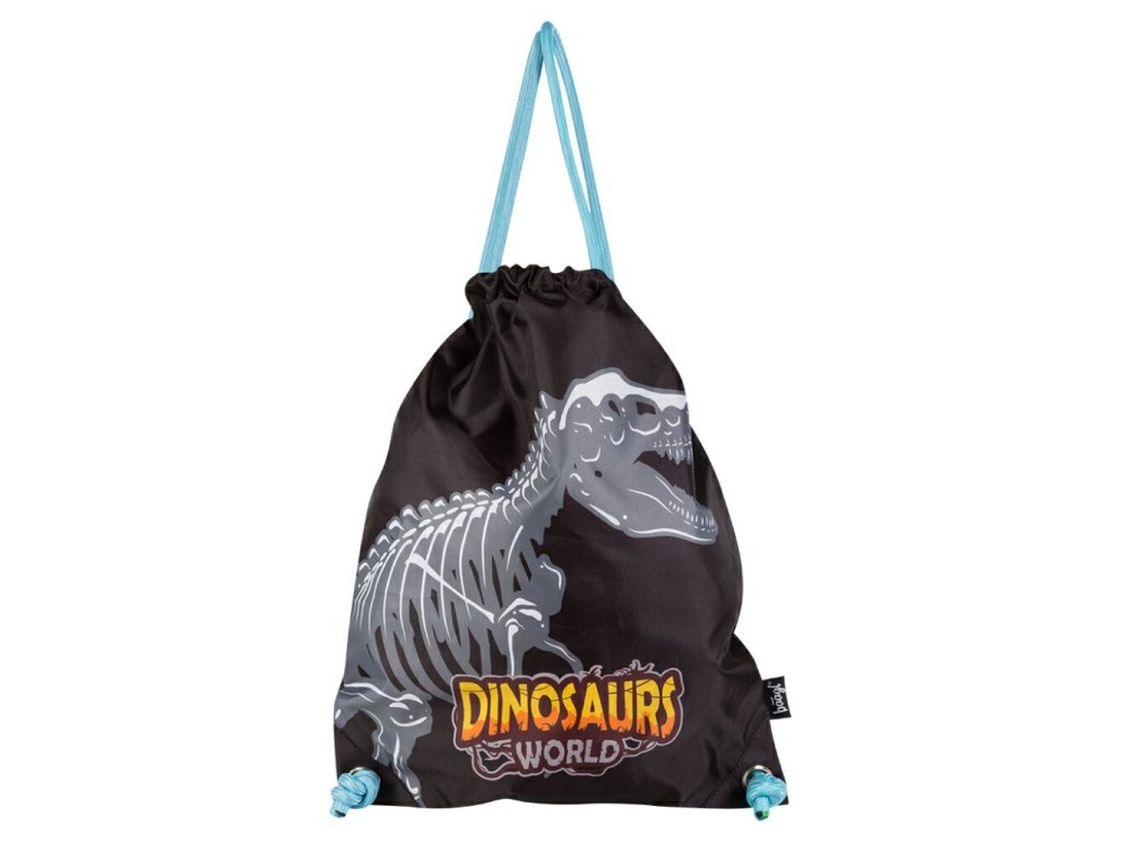 Černý sáček na cvičky s potiskem dinosaura a modrými tkanicemi.