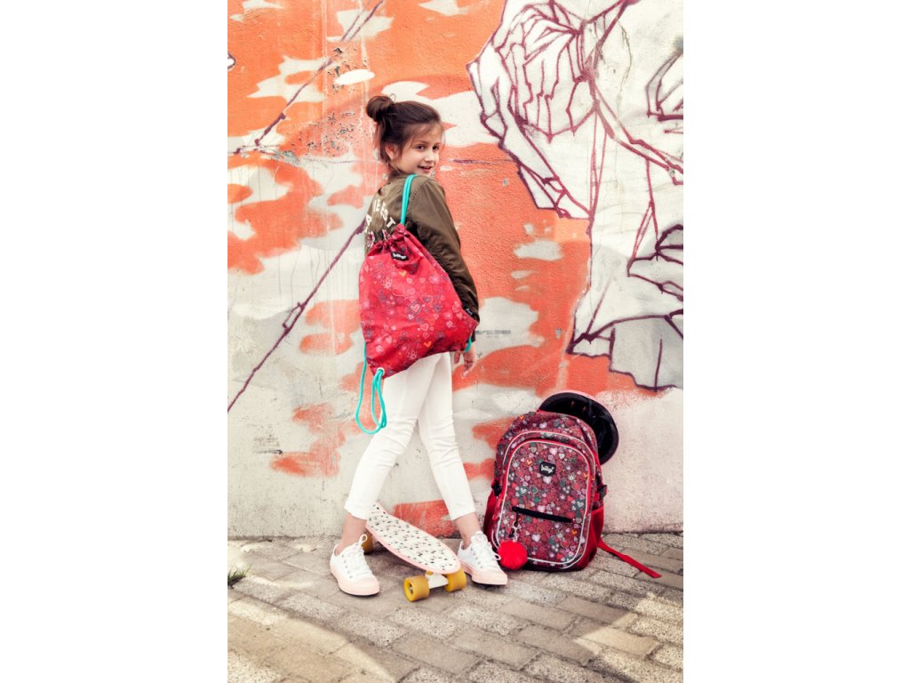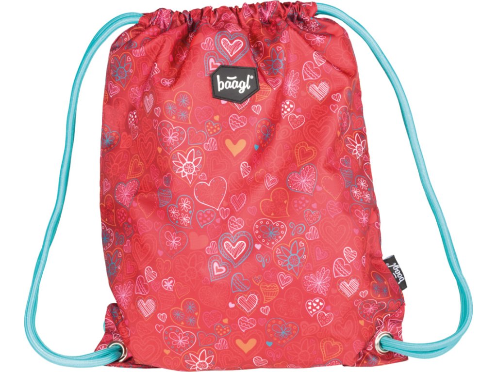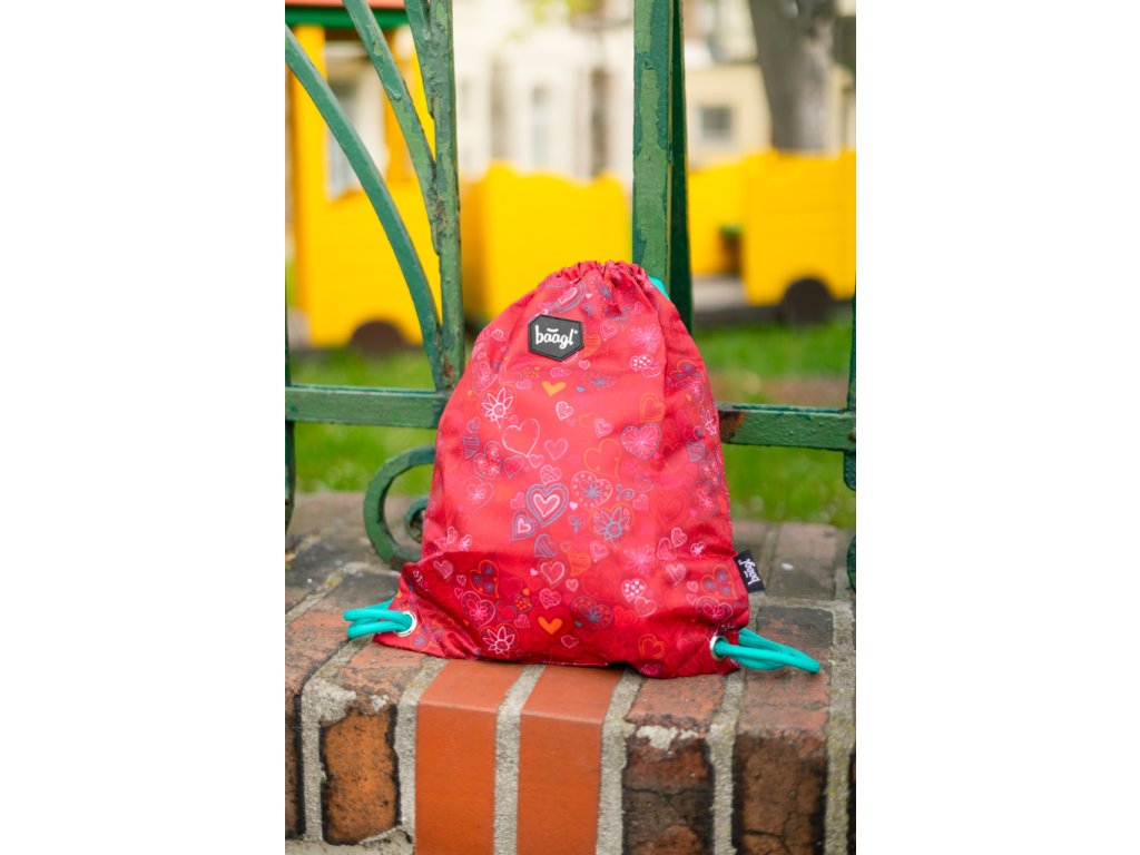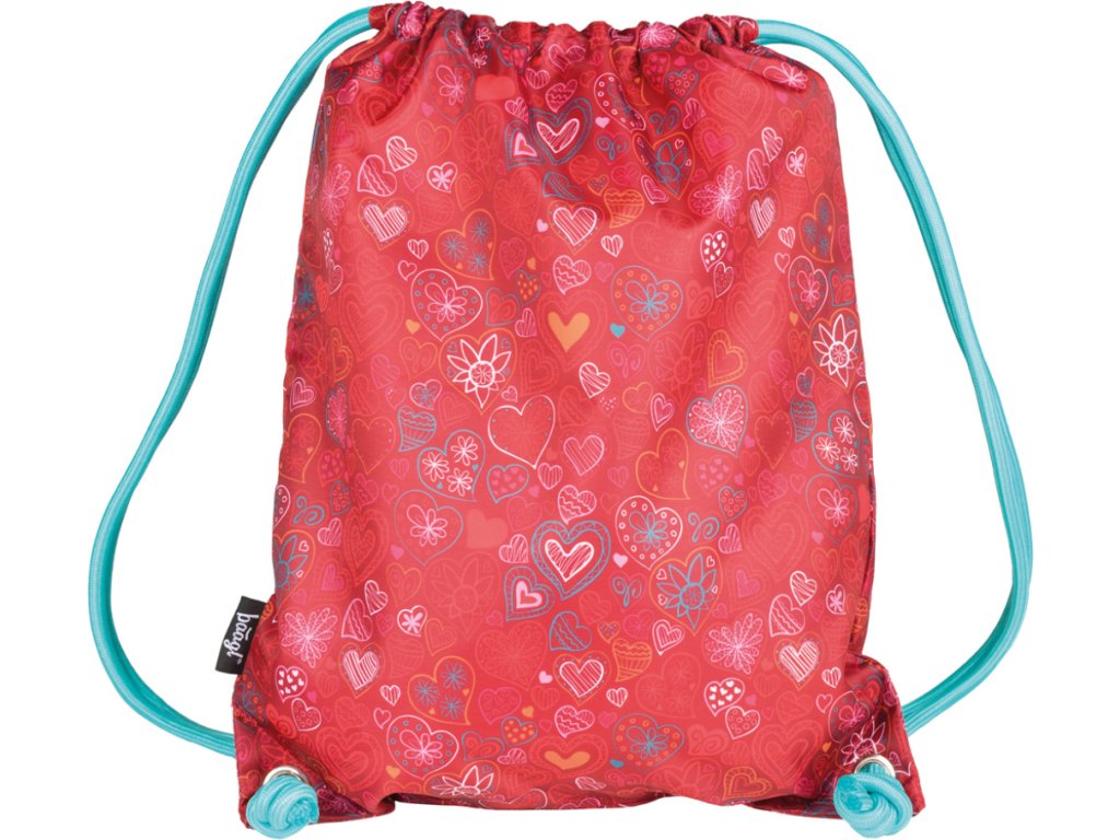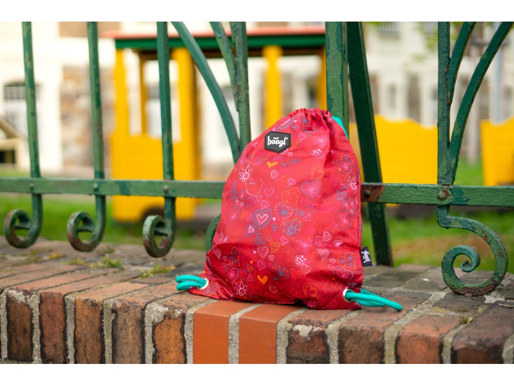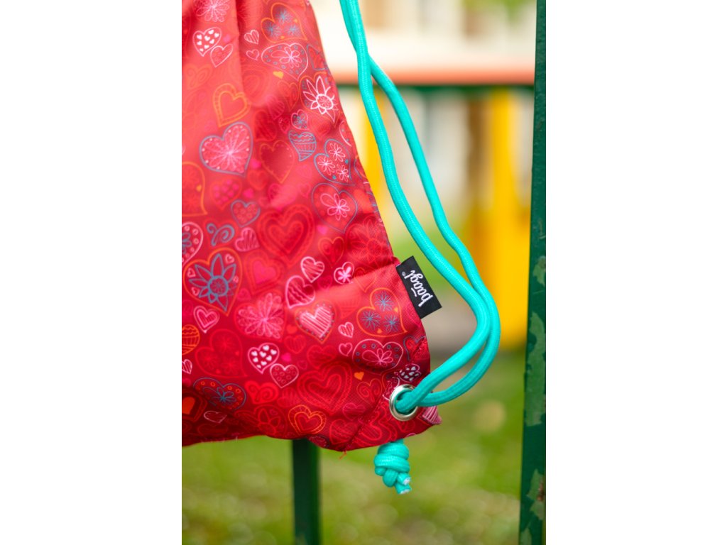 Červený sáček na cvičky nebo přezůvky s potiskem srdíček, který zaujme každou školačku.