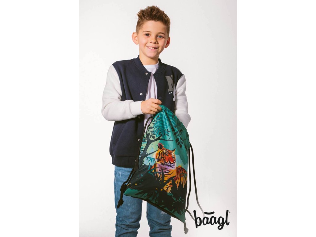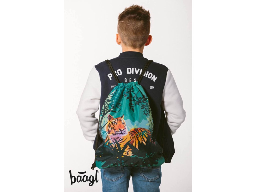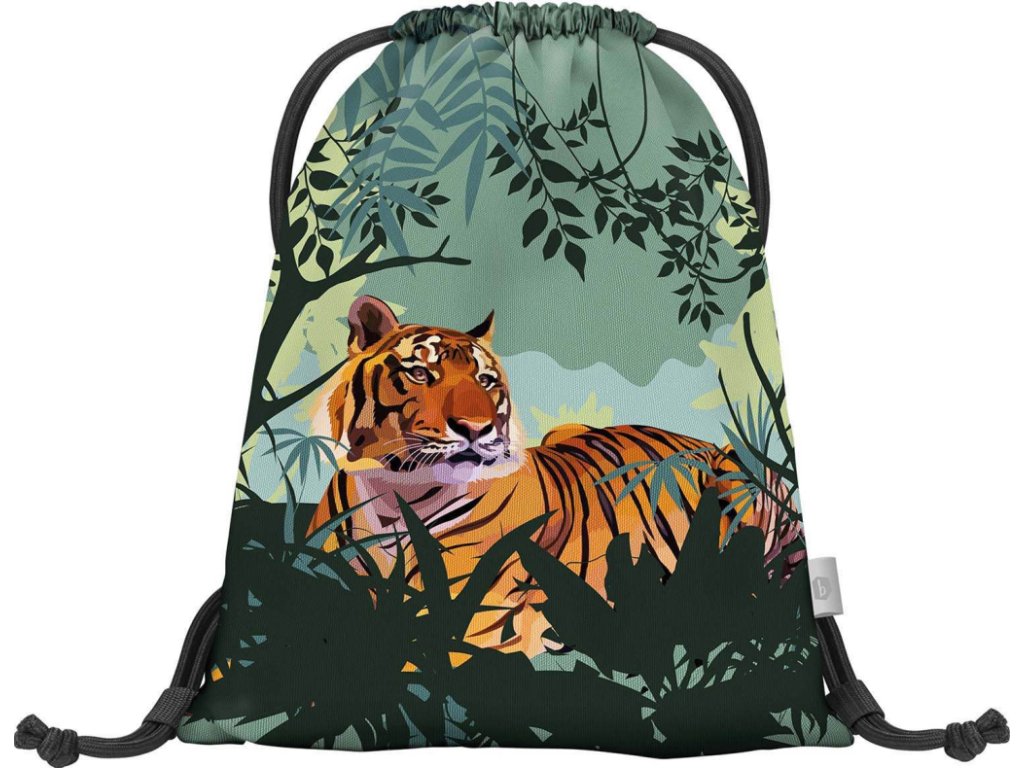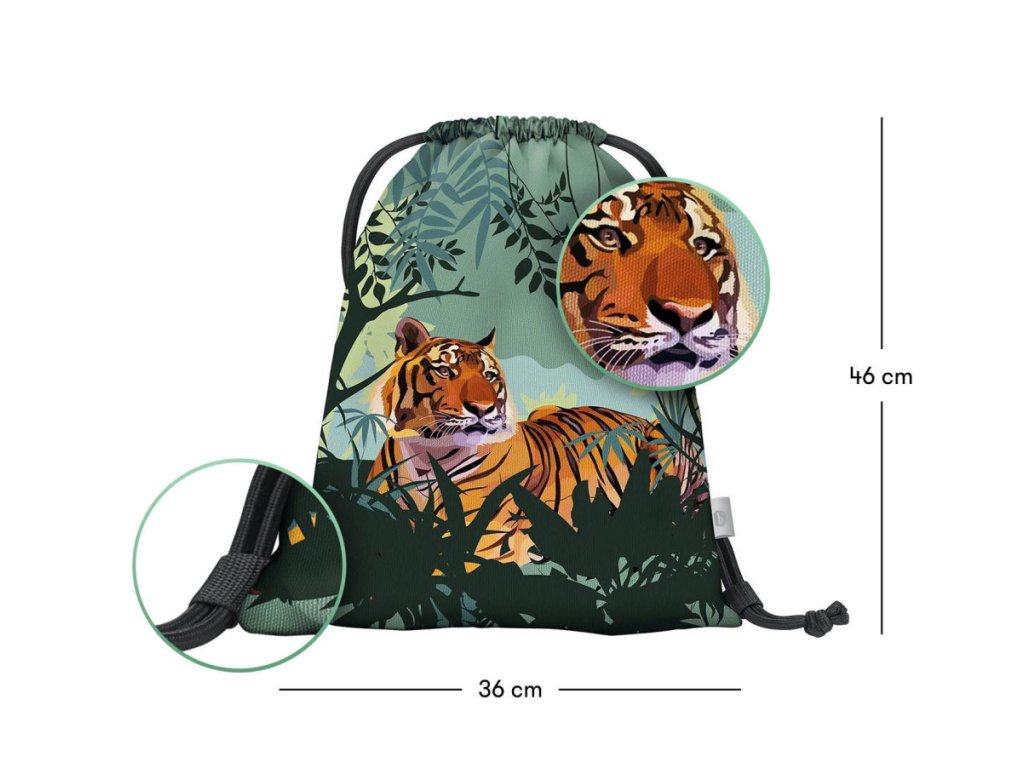 Klučičí sáček na obuv nebo na tělocvik Tygr je vyroben z pevného voděodolného materiálu se silnými šňůrami pro pohodlné nošení na zádech.