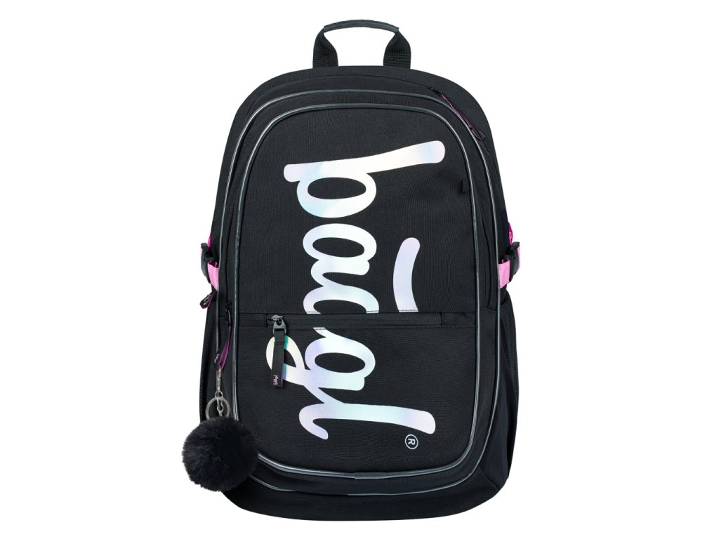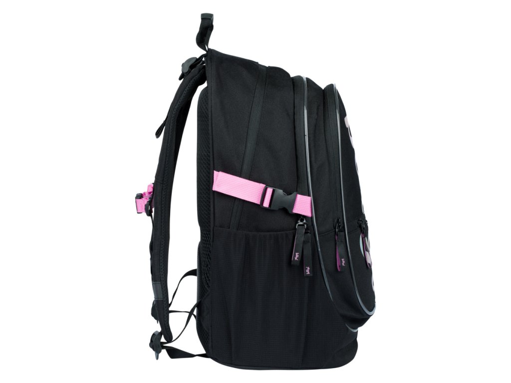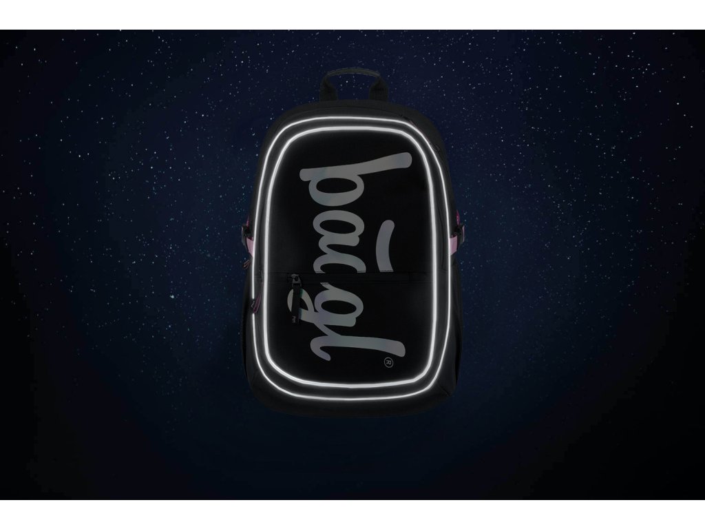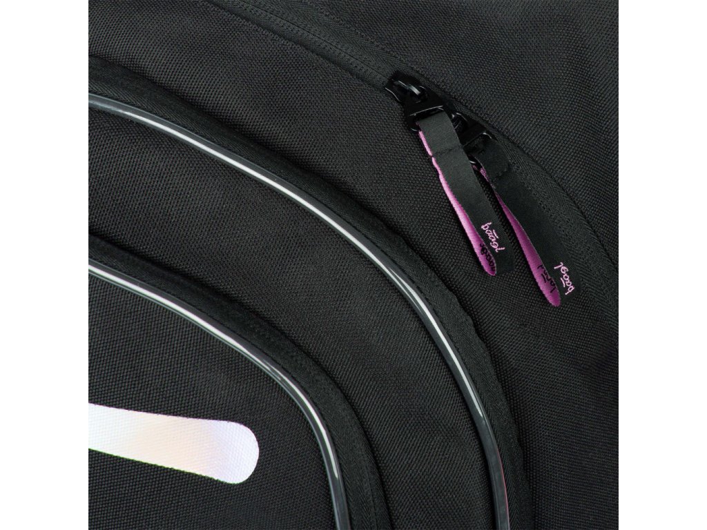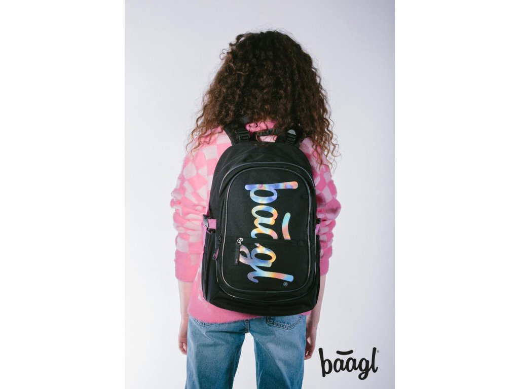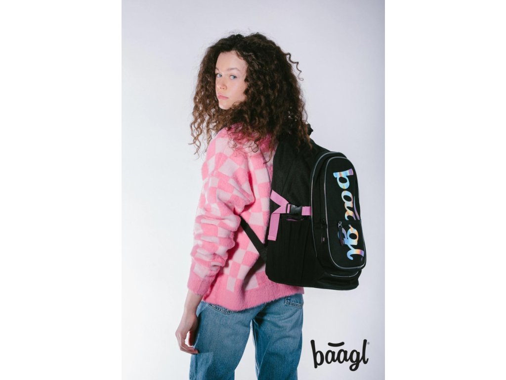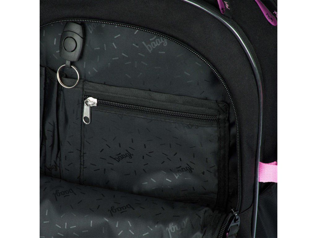 Černý batoh z řady Core s logem BAAGL na přední straně a růžovými detaily.
