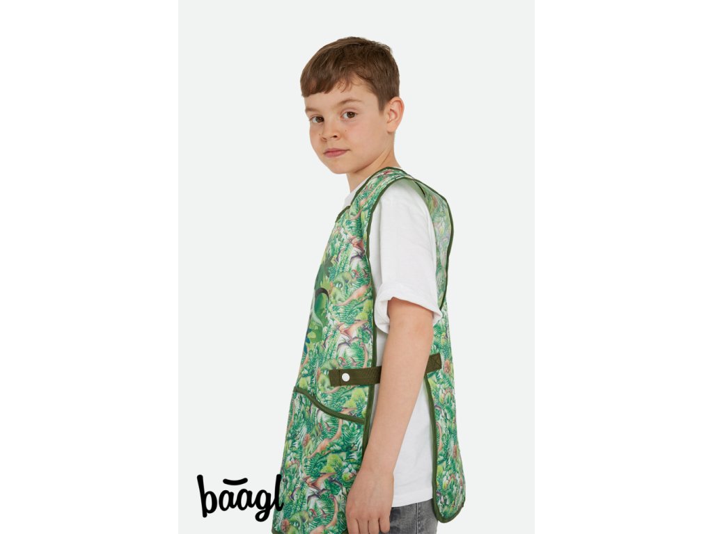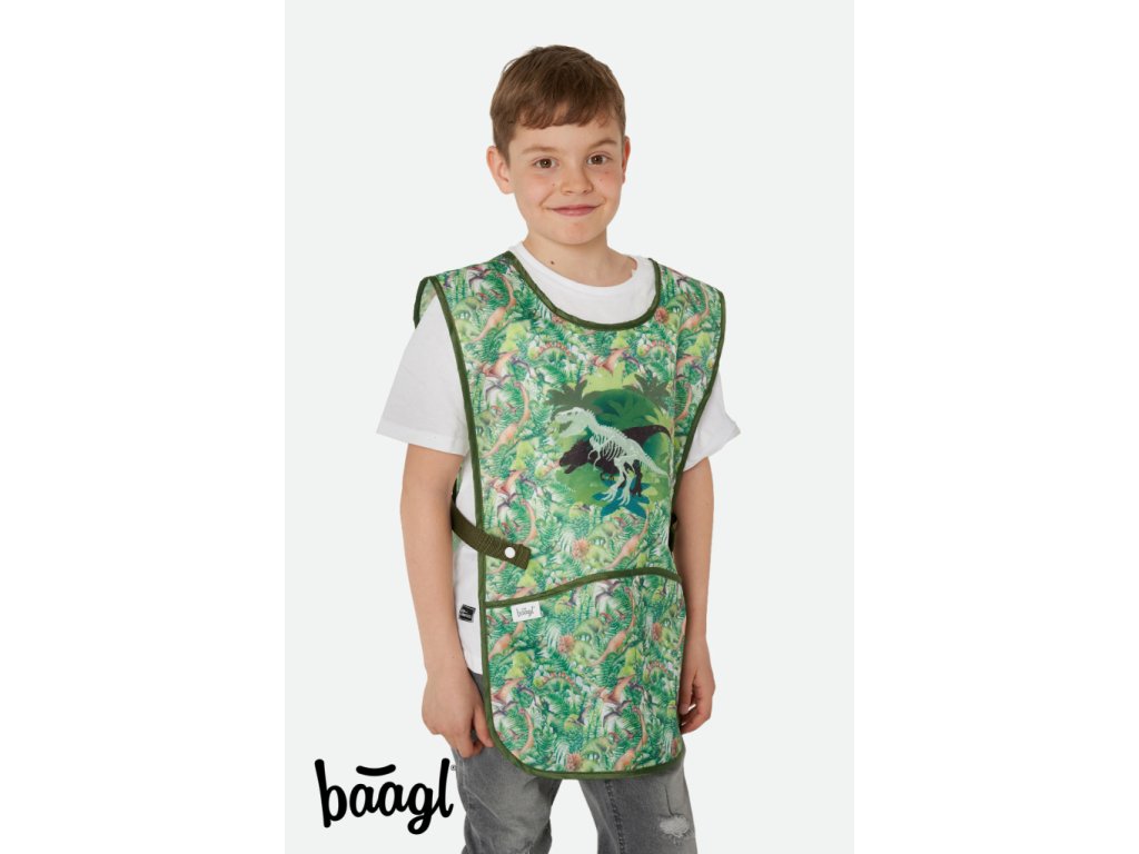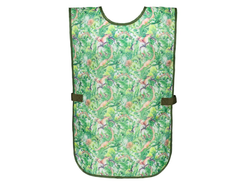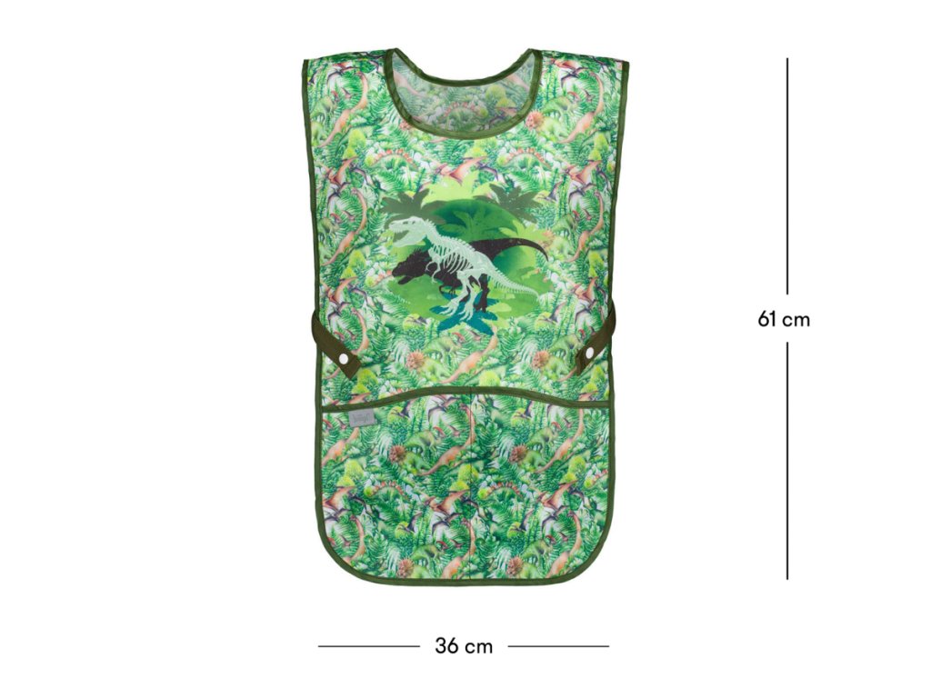 Zelenkavá zástěrka s motivem T-Rexe. Má nový praktický střih a zapínání na patentky. Už žádné vázání a hurá na malování.