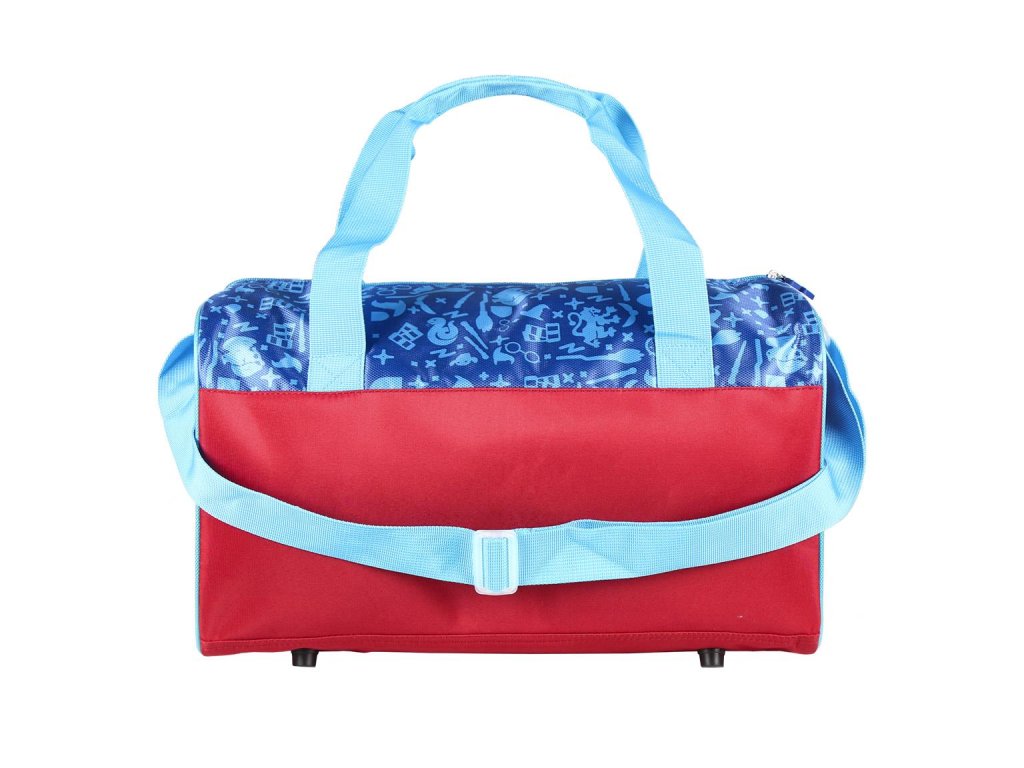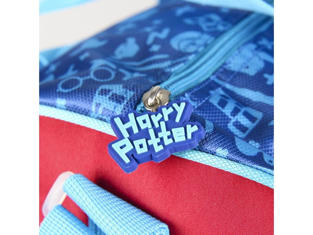 Modročervená sportovní taška s popruhem přes rameno a motivem postav ze slavné knižní a filmové ságy Harry Potter v kresleném stylu Chibi.