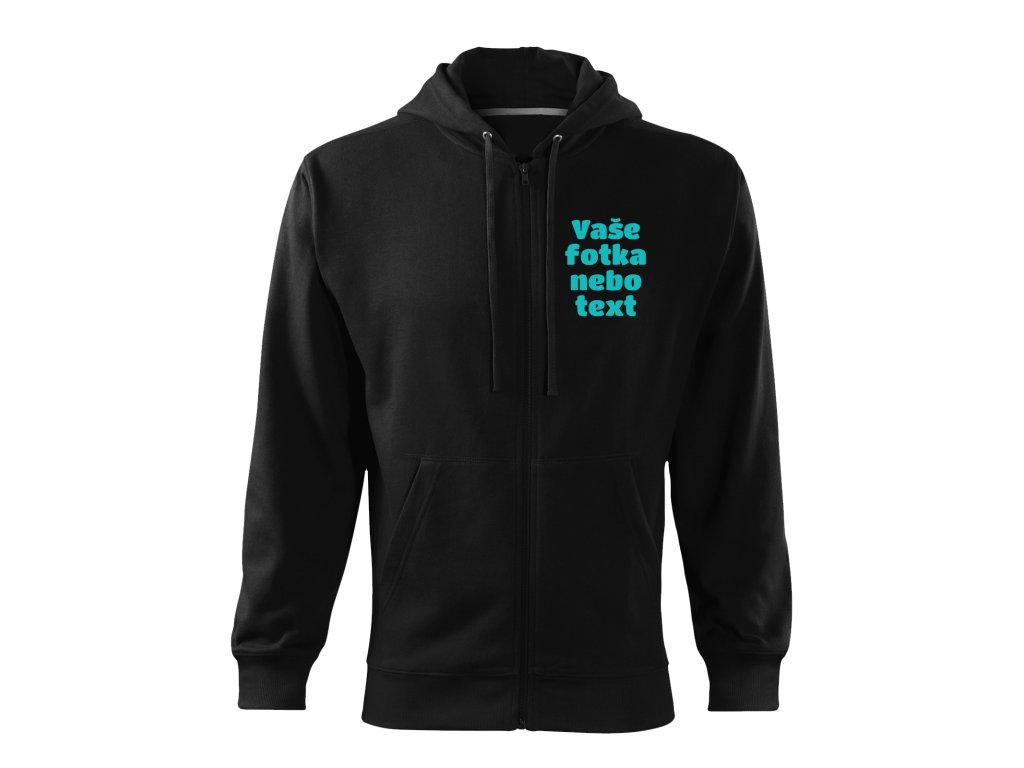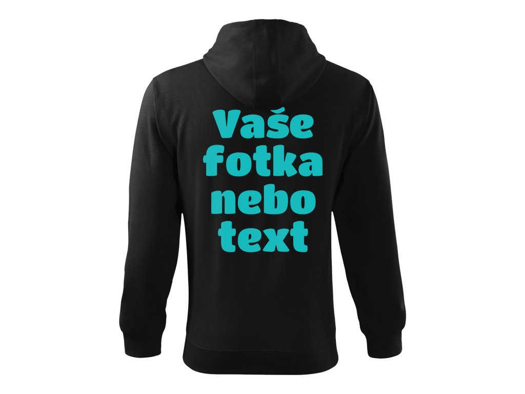 Černá bavlněná mikina s kapucí a na zip na kterou vám natiskneme vlastní fotku, text či obrázek.