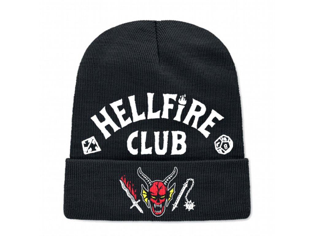Černá zimní čepice značky Beechfield z jemného materiálu s ohrnutým lemem a motivem loga Hellfire Clubu ze čtvrté série jednoho z nejlepších seriálů současnosti STRANGER THINGS.